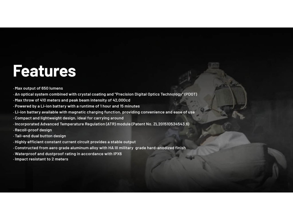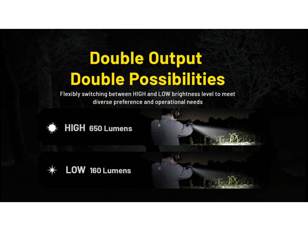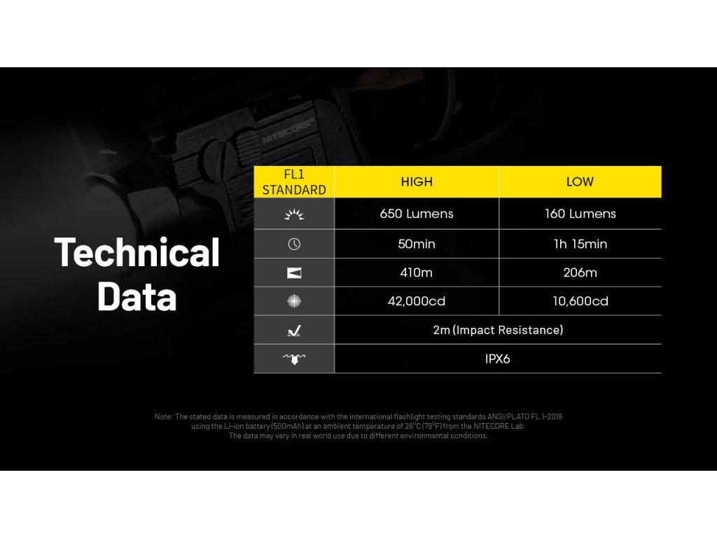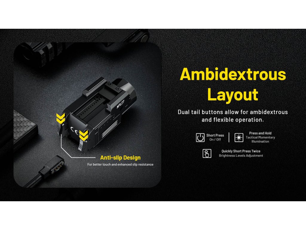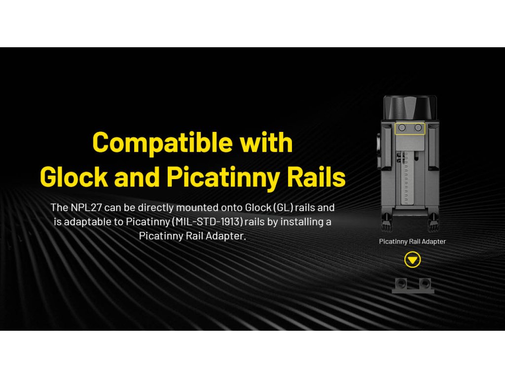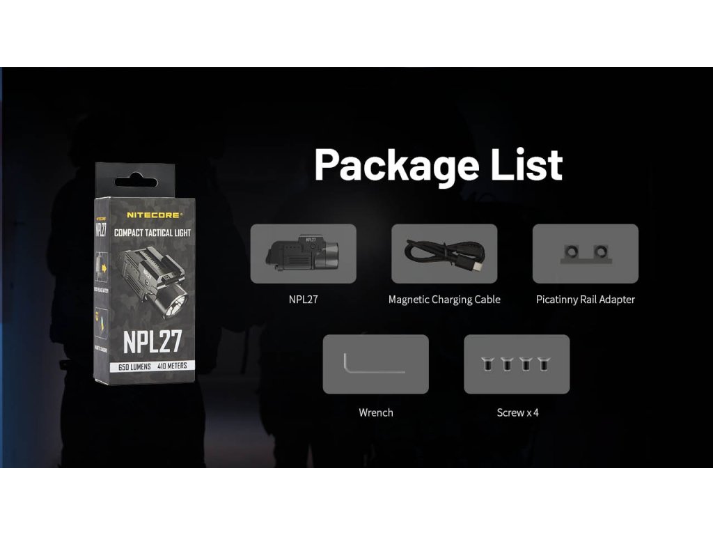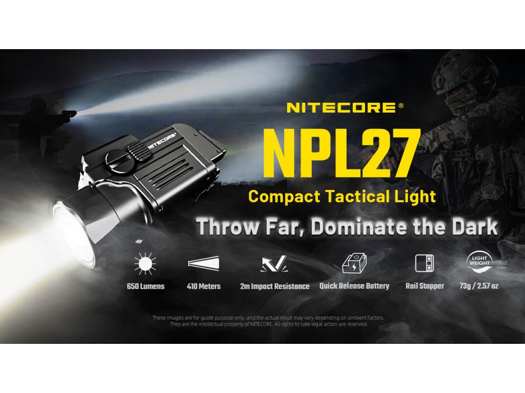NITECORE NPL27 je ultra kompaktné taktické svietidlo na zbraň s hmotnosťou len 73g, výkonom 650 lúmenov a dosahom 410 metrov. Vybavené Battery Latch Lock systémom pre rýchlu výmenu batérie, posuvnou zarážkou lišty pre flexibilné nastavenie a odolnou konštrukciou proti spätným rázom pre stabilné osvetlenie.