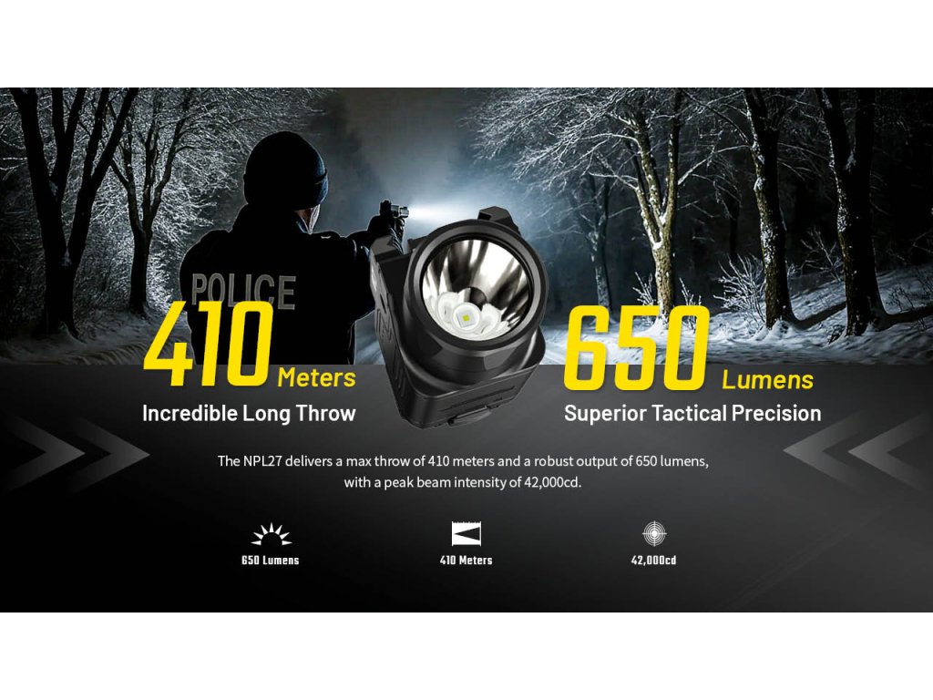 Pre policajných operátorov poskytuje NPL27 kritickú výhodu kompaktnosti a možnosť rýchlej výmeny batérie. Hmotnosť 73g minimalizuje zmeny rovnováhy zbrane zatiaľ čo Battery Latch Lock umožňuje výmenu batérií v teréne bez prestoja. Odolná konštrukcia proti spätným rázom zabezpečuje konzistentné osvetlenie aj v situáciách vysokého stresu. Posuvné nastavenie pozície na lište vyhovuje rôznym zbraňovým platformám a taktickým preferenciám.
