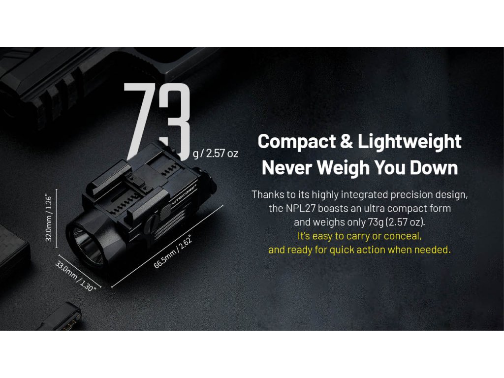 S hmotnosťou len 73g a rozmermi 65,5 × 33 × 32mm je NPL27 navrhnuté pre maximálnu prenosnosť. Vysoko integrovaný presný dizajn ponúka ultra kompaktné rozmery, ktoré vás nikdy nezaťažia. Ľahké na nosenie alebo skrytie a pripravené na rýchlu akciu keď je potrebné. Kompaktná veľkosť minimalizuje zmeny profilu zbrane zatiaľ čo poskytuje plnú taktickú osvetľovaciu schopnosť. Dokonalá rovnováha medzi výkonom a prenosnosťou pre profesionálne aplikácie.