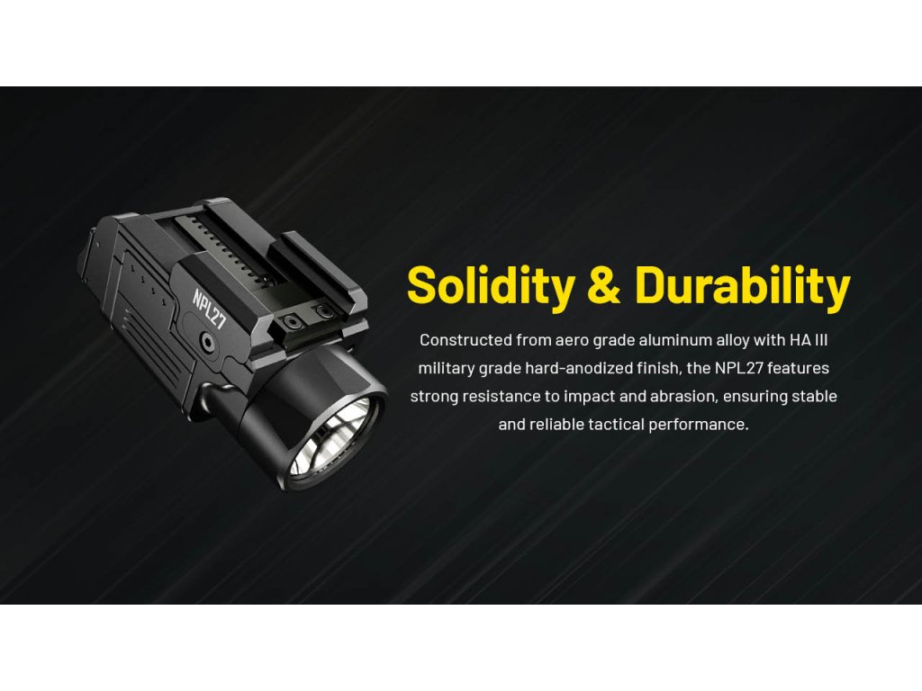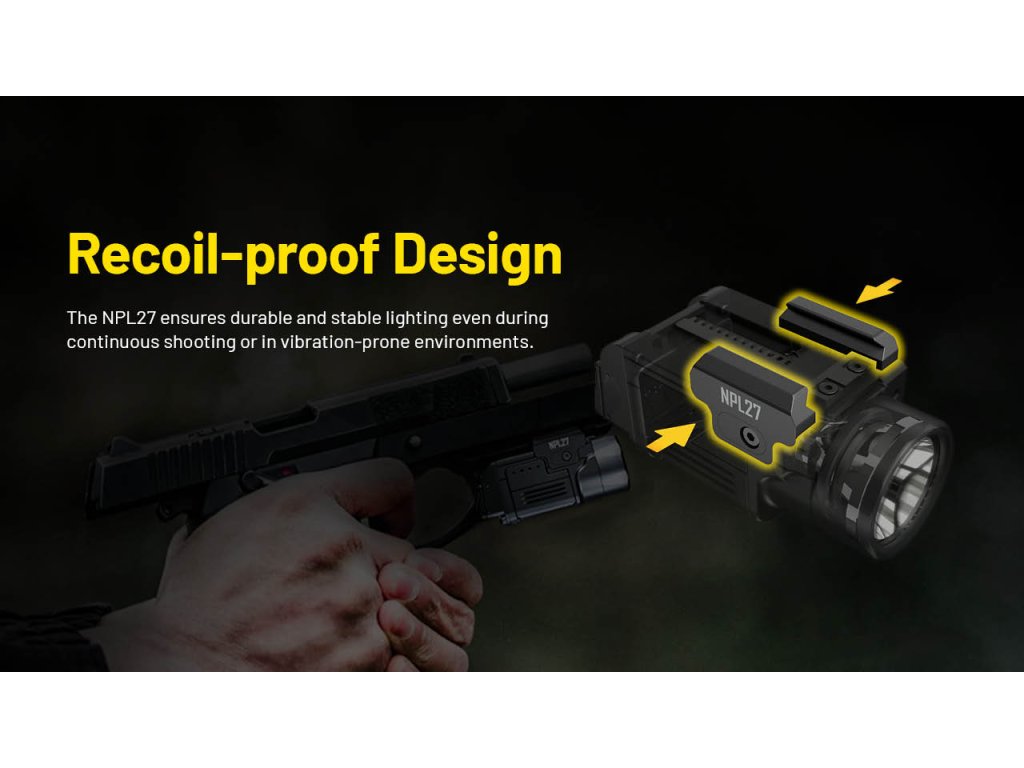 NPL27 využíva dizajn odolný proti spätným rázom, ktorý zabezpečuje trvalé a stabilné osvetlenie aj počas nepretržitej streľby alebo v prostrediach náchylných na vibrácie. Letecká hliníková zliatina s vojenskou tvrdou anodizáciou HA III poskytuje výnimočnú odolnosť proti nárazom a koróziu. Testovaná nárazuvzdornosť do 2 metrov spĺňa vojenské normy pádových testov. Presne navrhnuté montážne rozhranie zabezpečuje konzistentnú presnosť aj pri opakovaných spätných rázoch.