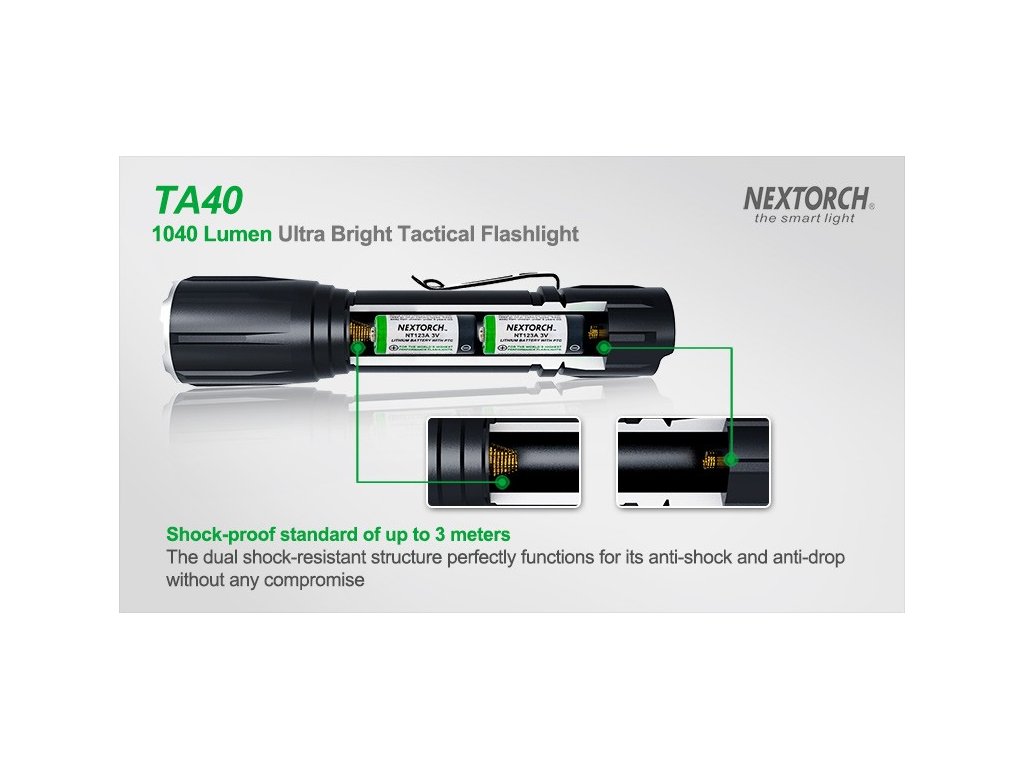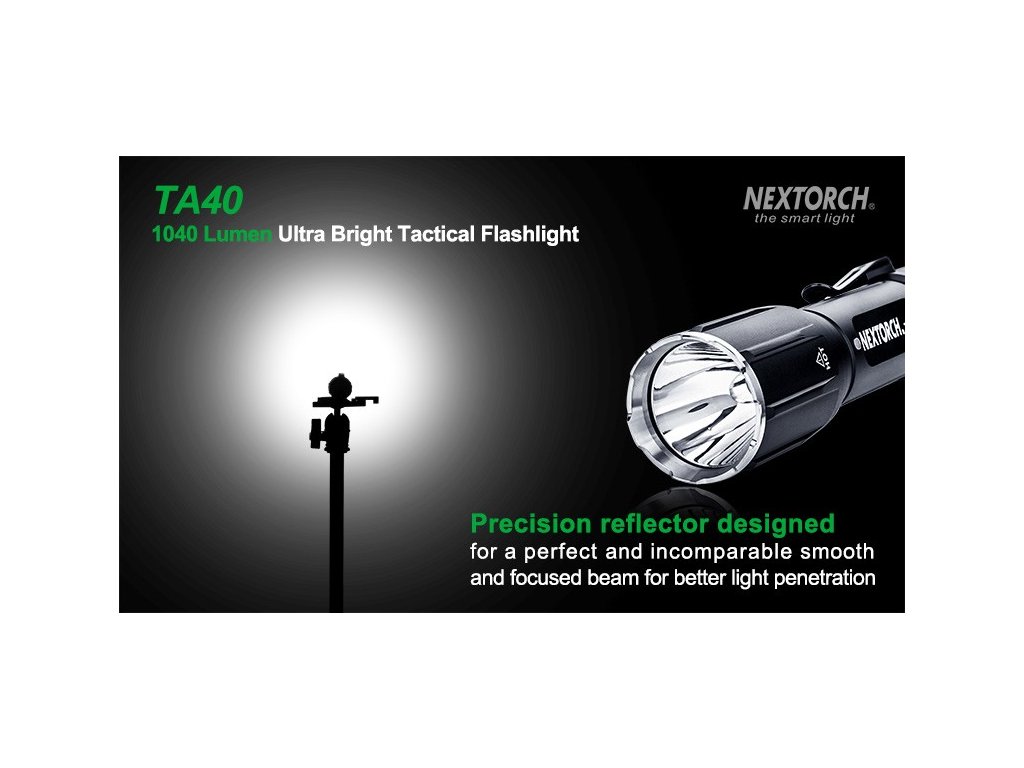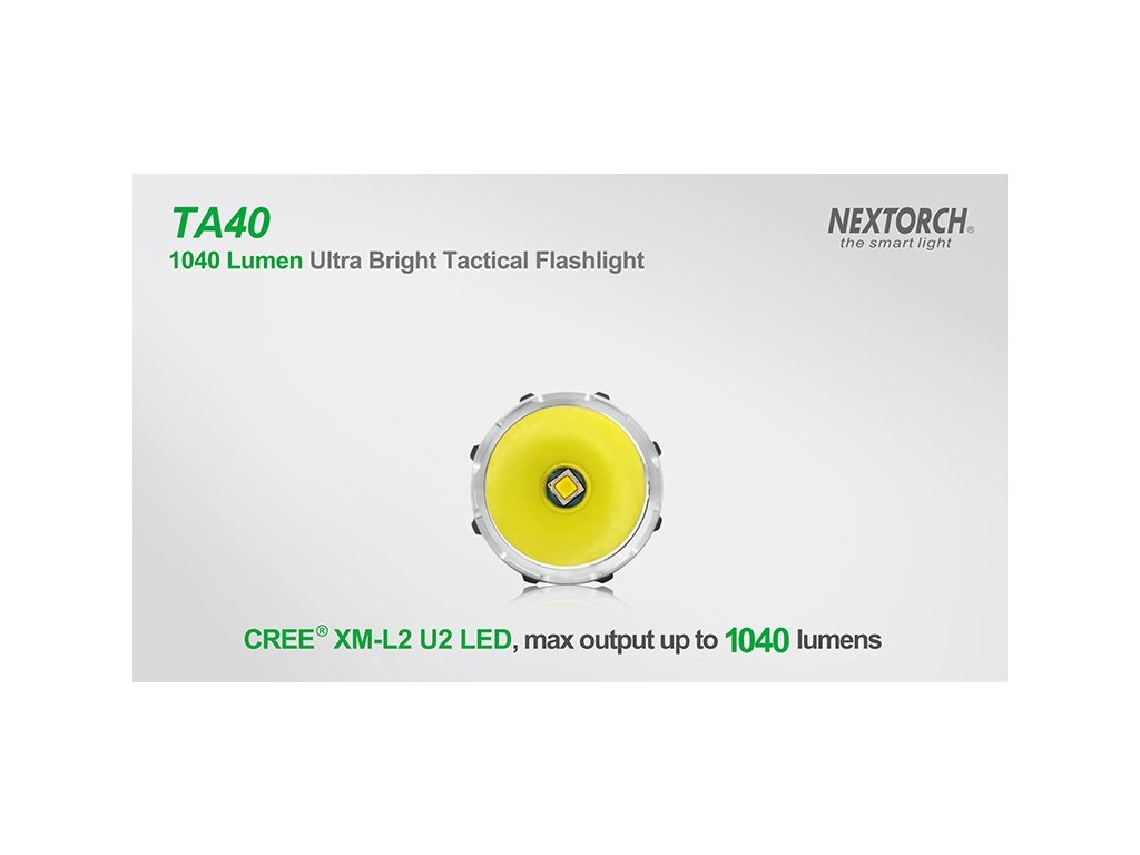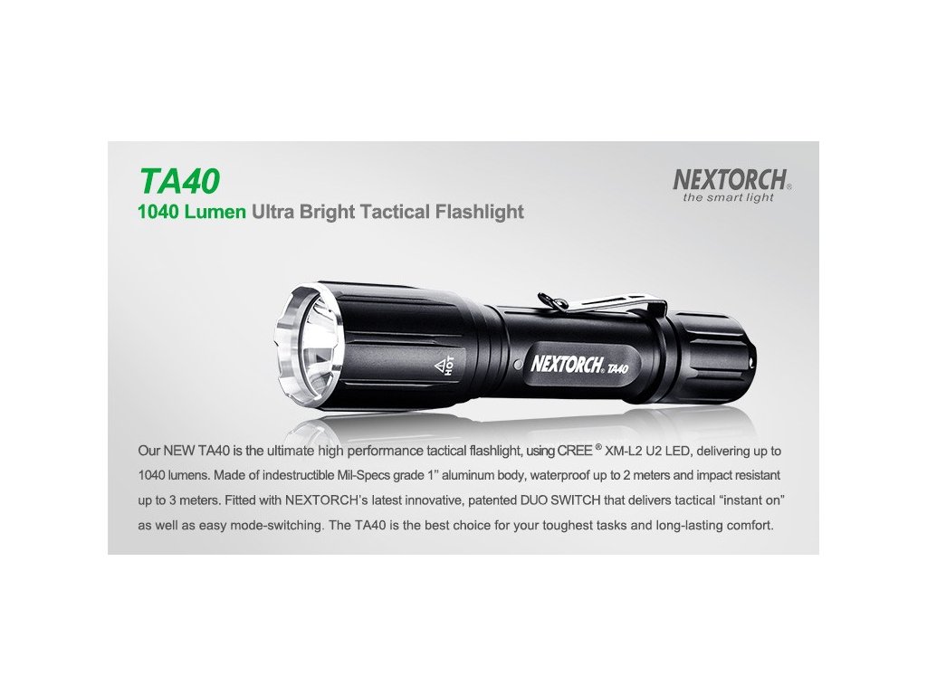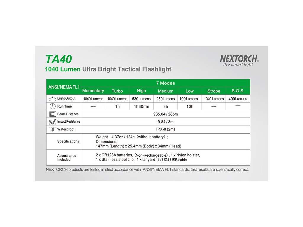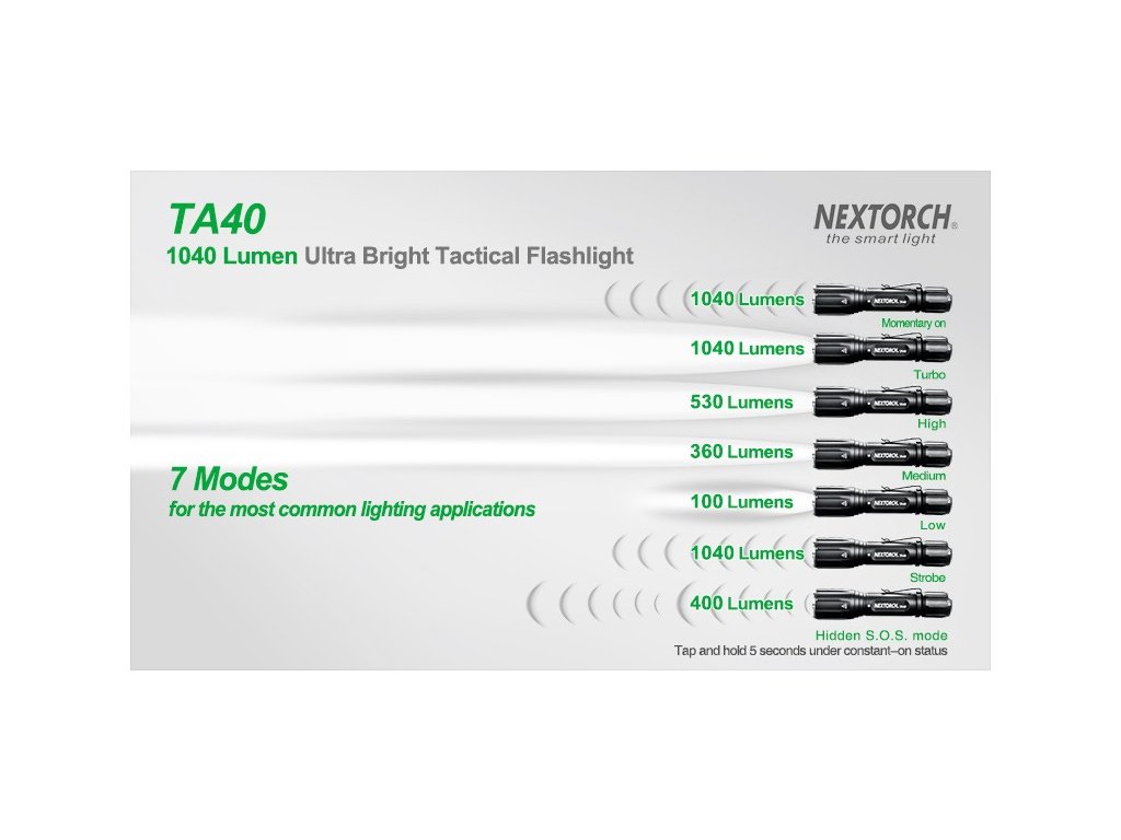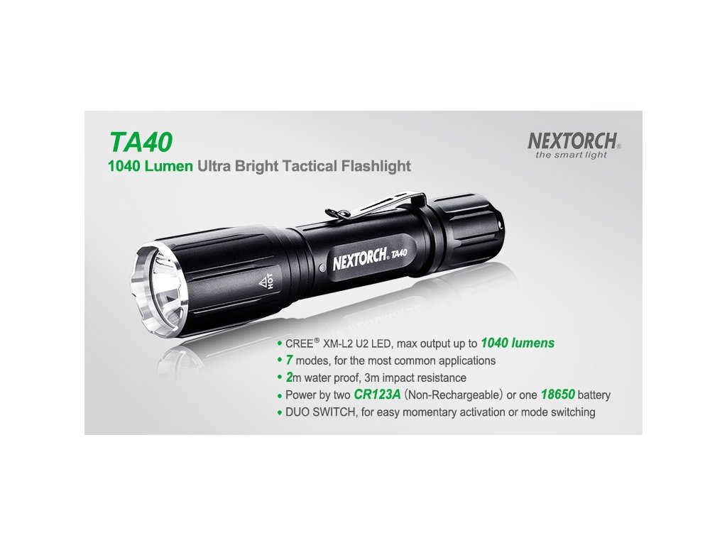 Nextorch TA40 Full Set je ideálnou voľbou pre tých, ktorí uvažujú o využití svietidla nielen pre bežné používanie, ale zároveň pre použitie na poľovné účely. Úctyhodný svetelný výkon 1040 lúmenov s dosvitom 285 metrov. K zavedenemým vlastnostiam taktického svietidla Nextorch, tiež patrí inovatívne zadný switch spínač. Ten umožňuje tiché zopnutie pri jemnom pridržaní tlačidla (momentová aktivácia počas doby držania spínača). TA40 ponúka 4 svetelné režimy: 100%, 51%, 24%, 8% + 1 zábleskový režim STROBE. Režimy pre nastavenie výkonu svietenia sa hodia predovšetkým pre úsporu akumulátora. Vďaka tomu, bežne dostačujúci výkon 80 lumenov, vydrží pracovať 10 hodín. Naopak v prípade, keď potrebujete dokonalý prehľad o situácii vrátane vzdialených predmetov, využijete maximálne režim 100% 1040lm. Taktický režim stroboskopu, slúži ako skvelý pomocník pri sebaobrane, kedy útočníka prakticky oslepí na niekoľko minút. Svietidlo Nextorch TA40 je napájané nabíjacím Li-Ion akumulátorom Nextorch 18650 s kapacitou 2600mAh (je súčasťou balenia). Môže byť tiež napájaná na jednorázové 2x CR123A 3V batérie. Rovnako ako ostatné svietidla je model TA40 vyrobený z leteckého hliníka 6061-T6 odolného proti poškriabaniu a je tiež vodeodolný podľa IPX-8 štandardu. Použitá LED Cree XM-L2 U2, patria ku klasike s garanciou výdrže viac ako 50 000 hodín. Ultra číra šošovka, ponúka špičkovú svetelnú priepustnosť a pri tom vysokú odolnosť proti prasknutiu či poškrabaniu. K celkovému dokonalému výkonu potom prispieva technológia reflektora, v ktorom je LED uložená a to predovšetkým vďaka optimálnemu tvaru i lesku povrchu. To zaručuje maximálny prenos svetla i jeho zaostrenie podľa účelu použitia. Všetky svietliá Nextorch sú certifikované podľa celosvetovo uznávaného amerického ANSI/ NEMA FL1 štandardu, ktorý zaručuje, že udávané hodnoty sú merané jednotnou metodikou a tieto hodnoty sú garantované. Namerané hodnoty, ktoré sú udávané v parametroch sú pravdivé.