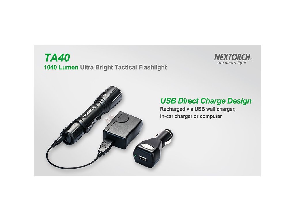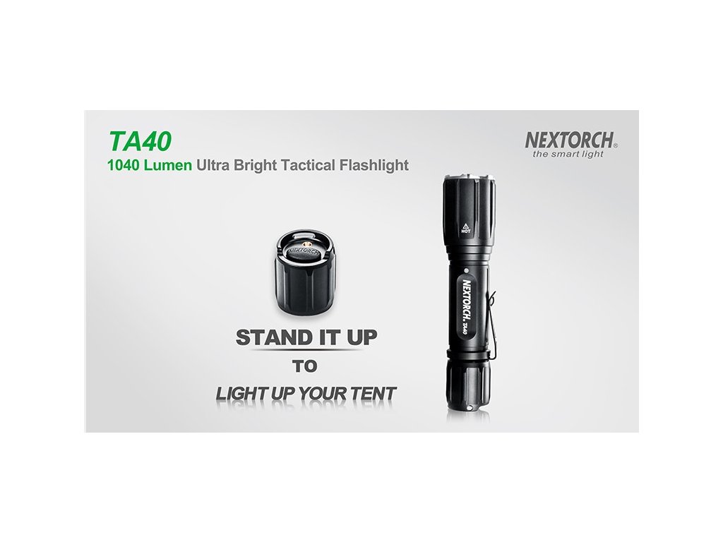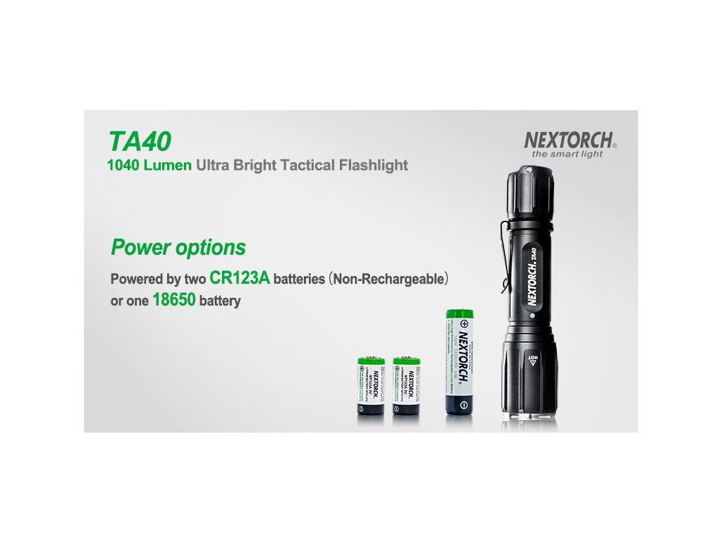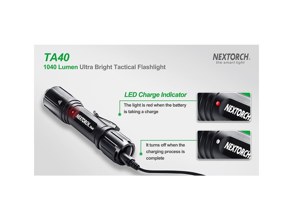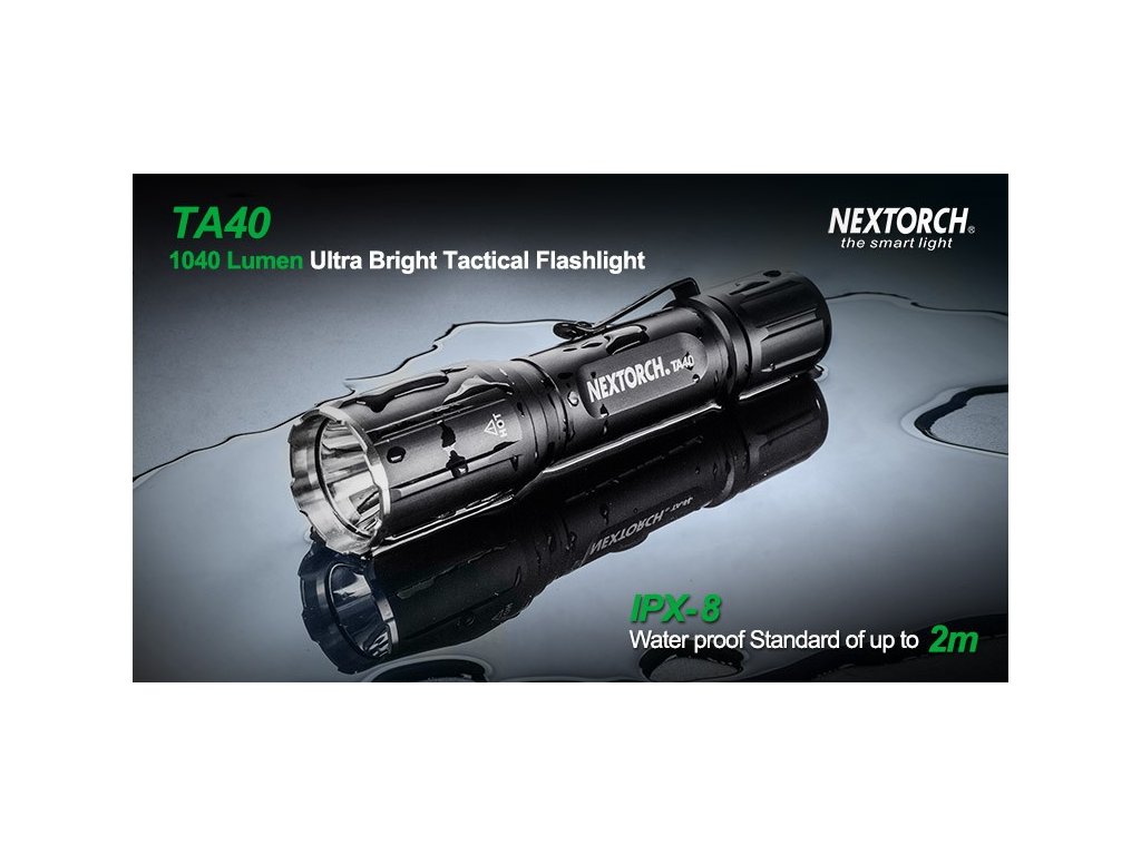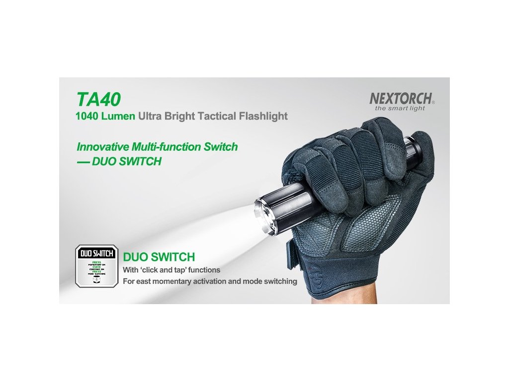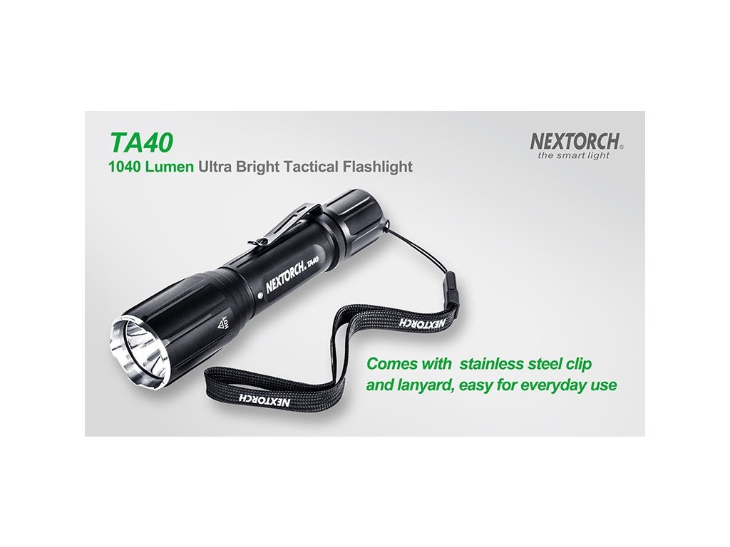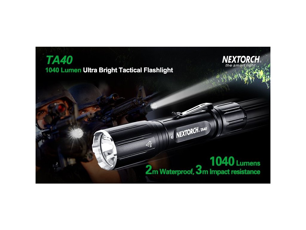 Nextorch TA40 Full Set je ideálnou voľbou pre tých, ktorí uvažujú o využití svietidla nielen pre bežné používanie, ale zároveň pre použitie na poľovné účely. Úctyhodný svetelný výkon 1040 lúmenov s dosvitom 285 metrov. K zavedenemým vlastnostiam taktického svietidla Nextorch, tiež patrí inovatívne zadný switch spínač. Ten umožňuje tiché zopnutie pri jemnom pridržaní tlačidla (momentová aktivácia počas doby držania spínača). TA40 ponúka 4 svetelné režimy: 100%, 51%, 24%, 8% + 1 zábleskový režim STROBE. Režimy pre nastavenie výkonu svietenia sa hodia predovšetkým pre úsporu akumulátora. Vďaka tomu, bežne dostačujúci výkon 80 lumenov, vydrží pracovať 10 hodín. Naopak v prípade, keď potrebujete dokonalý prehľad o situácii vrátane vzdialených predmetov, využijete maximálne režim 100% 1040lm. Taktický režim stroboskopu, slúži ako skvelý pomocník pri sebaobrane, kedy útočníka prakticky oslepí na niekoľko minút. Svietidlo Nextorch TA40 je napájané nabíjacím Li-Ion akumulátorom Nextorch 18650 s kapacitou 2600mAh (je súčasťou balenia). Môže byť tiež napájaná na jednorázové 2x CR123A 3V batérie. Rovnako ako ostatné svietidla je model TA40 vyrobený z leteckého hliníka 6061-T6 odolného proti poškriabaniu a je tiež vodeodolný podľa IPX-8 štandardu. Použitá LED Cree XM-L2 U2, patria ku klasike s garanciou výdrže viac ako 50 000 hodín. Ultra číra šošovka, ponúka špičkovú svetelnú priepustnosť a pri tom vysokú odolnosť proti prasknutiu či poškrabaniu. K celkovému dokonalému výkonu potom prispieva technológia reflektora, v ktorom je LED uložená a to predovšetkým vďaka optimálnemu tvaru i lesku povrchu. To zaručuje maximálny prenos svetla i jeho zaostrenie podľa účelu použitia. Všetky svietliá Nextorch sú certifikované podľa celosvetovo uznávaného amerického ANSI/ NEMA FL1 štandardu, ktorý zaručuje, že udávané hodnoty sú merané jednotnou metodikou a tieto hodnoty sú garantované. Namerané hodnoty, ktoré sú udávané v parametroch sú pravdivé.