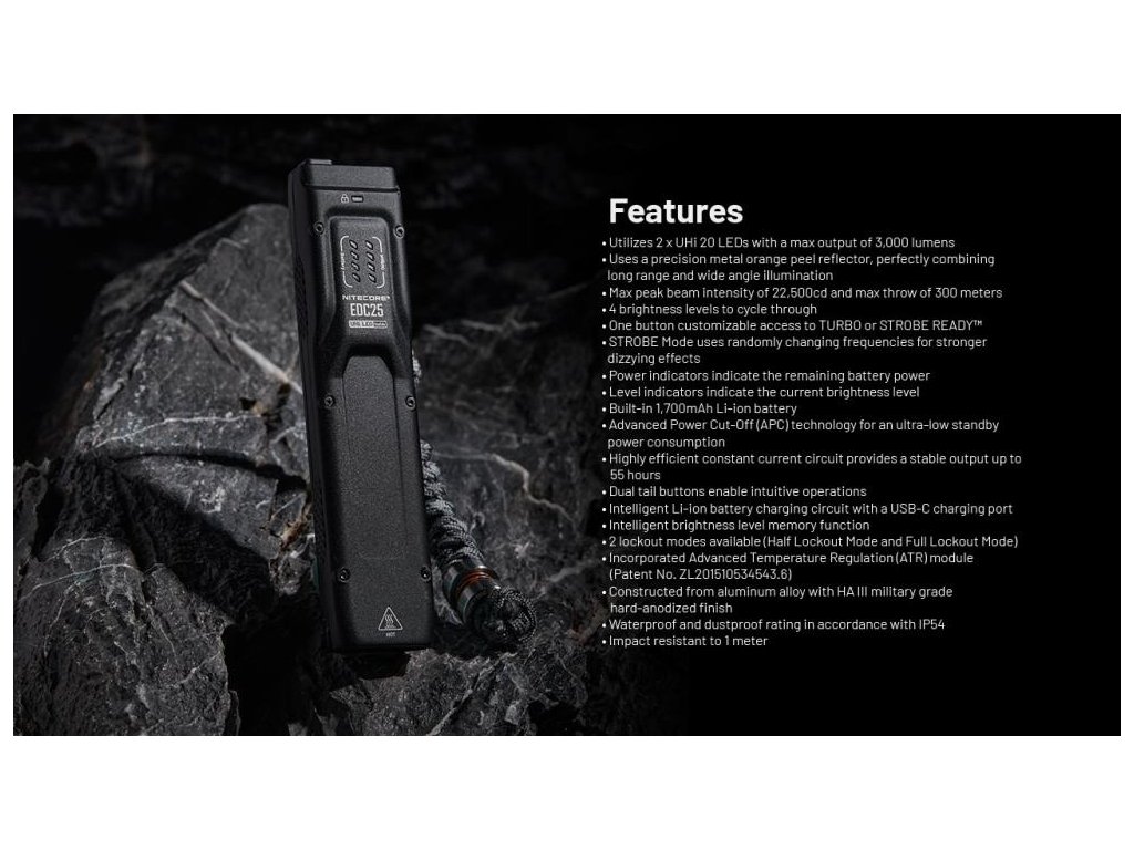 - Vybavená digitálnym displejom - režim, výdrž svietenia v dannom móde, stav akumulátora- Funkcia inteligentnej pamäte ukladá posledné nastavenie jasu alebo módu