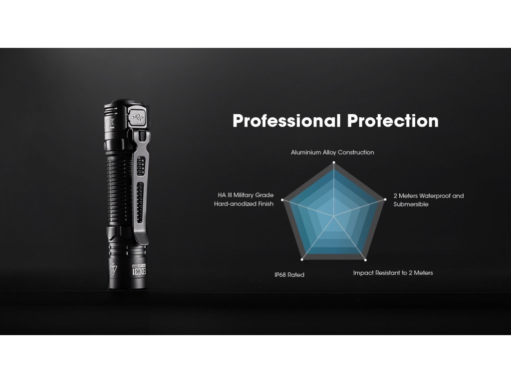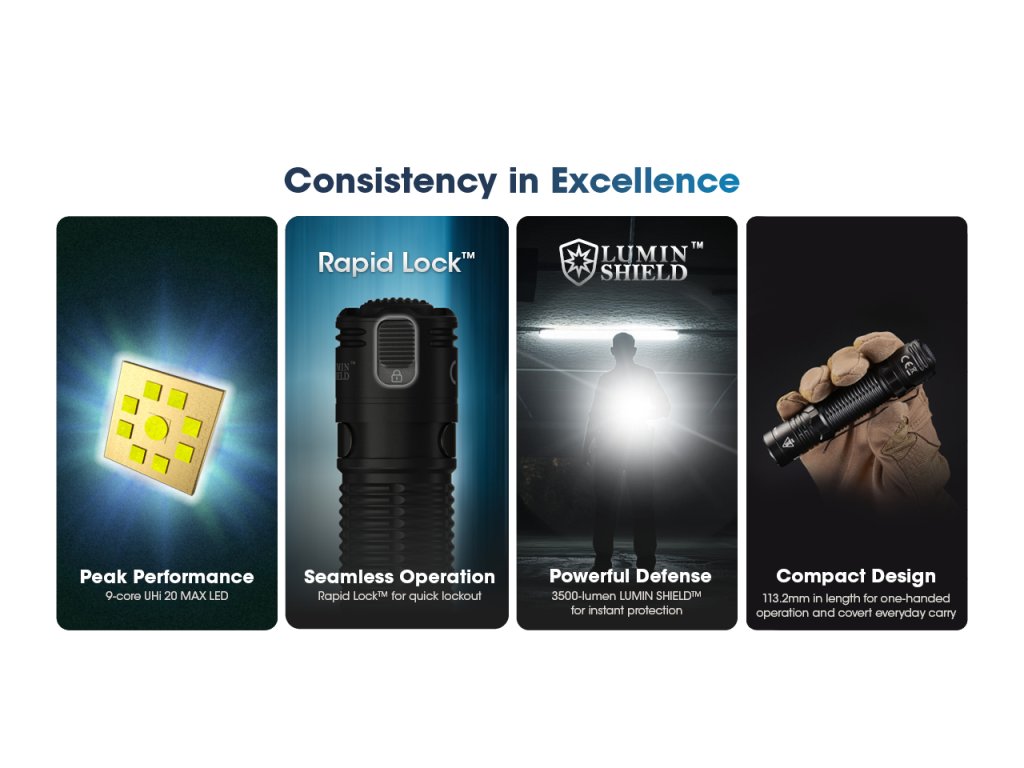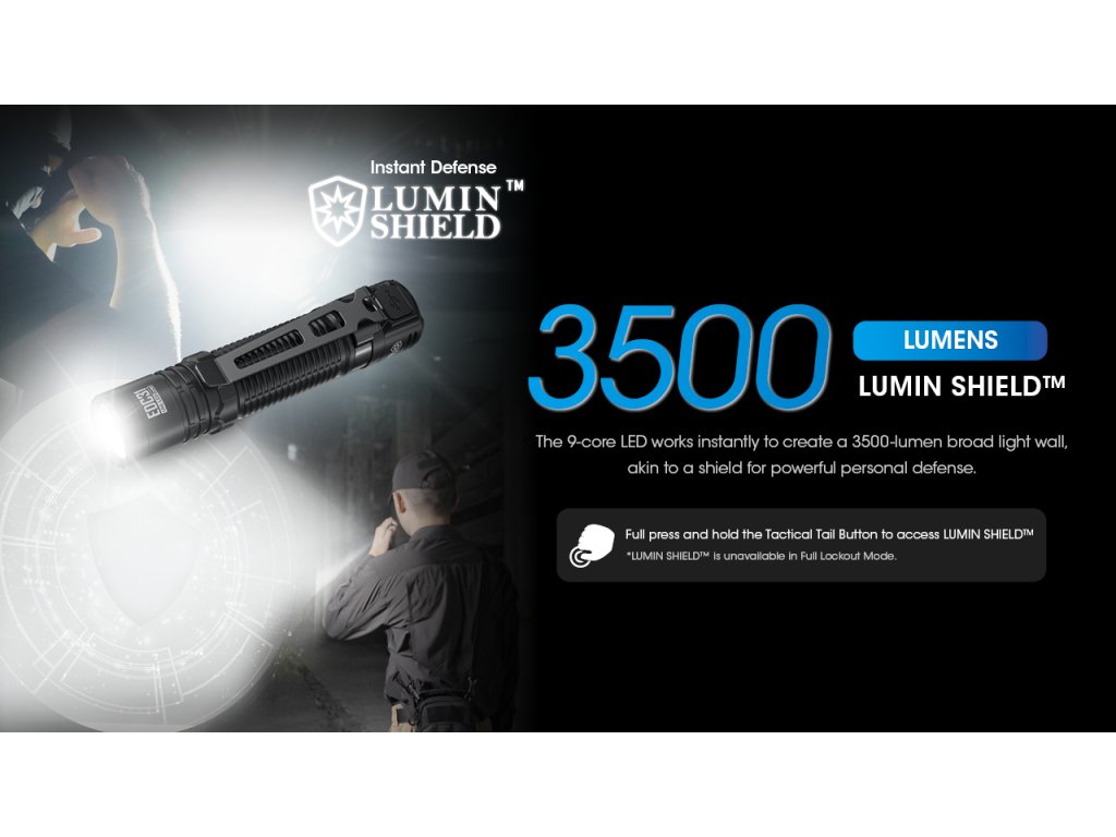 🔦 Kompaktné taktické svietidlo s výnimočným výkonom 3500 lumenov a dosvitom až 380 metrov. Vybavená revolučnou 9-jadrovou UHi 20 MAX LED technológiou a systémom LUMIN SHIELD™ pre okamžitú obranu. Ultra kompaktné rozmery (113,2 mm) a nízka hmotnosť (100 g) zabezpečujú pohodlné každodenné nosenie. Vodeodolné prevedenie IP68, odolnosť proti nárazom z 2 metrov a integrovaná 3800 mAh batéria pre výdrž až 57 hodín. 🛡️ 🏙️