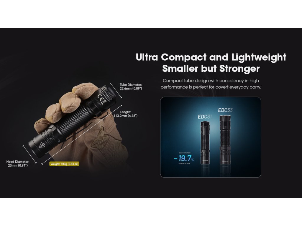 NITECORE EDC31 predstavuje špičku v oblasti kompaktných taktických svietidiel, navrhnutá pre profesionálov i náročných užívateľov, ktorí vyžadujú maximálny výkon v minimálnych rozmeroch. Táto prelomová svietidlo kombinuje 9-jadrovú UHi 20 MAX LED technológiu so sofistikovaným optickým systémom, čím dosahuje neuveriteľný svetelný tok 3500 lumenov a pôsobivý dosvit 380 metrov. Navzdory svojej mimoriadnej výkonnosti si EDC31 zachováva kompaktné rozmery len 113,2 mm, čo ju predurčuje na pohodlné každodenné nosenie.