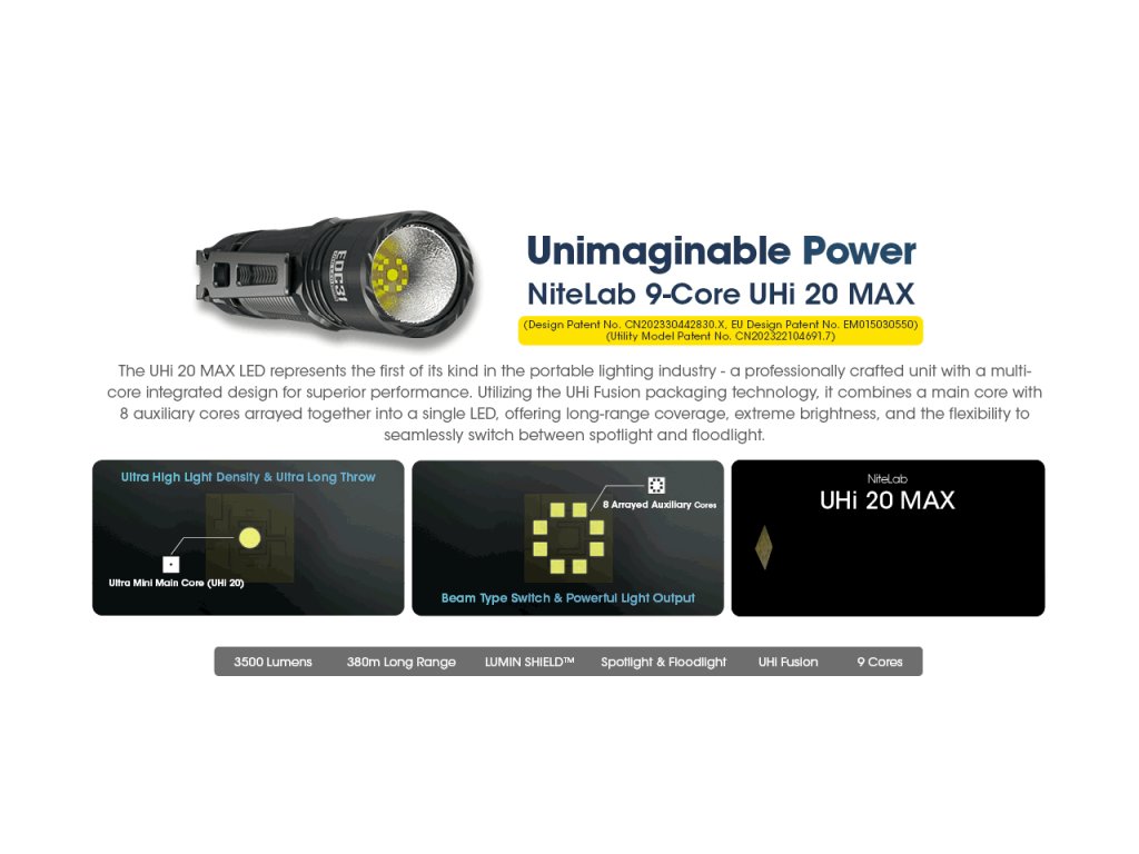 ⚙️ Srdcom svietidla je inovatívna UHi 20 MAX LED technológia vyvinutá spoločnosťou NiteLab, ktorá kombinuje hlavnú centrálnu LED s ôsmimi pomocnými LED diódami usporiadanými do jedinečnej 9-jadrovej konfigurácie. Tento pokročilý svetelný systém umožňuje okamžité prepínanie medzi dalekonosným bodovým svetlom (SEARCH mód s výkonom 1500 lumenov) a širokým osvetlením prostredia (LUMIN SHIELD mód s výkonom 3500 lumenov). V kombinácii s mikro-textúrovaným reflektorom tak poskytuje optimálne svetelné vlastnosti pre každú situáciu.