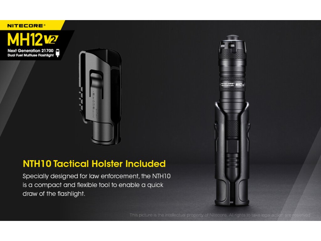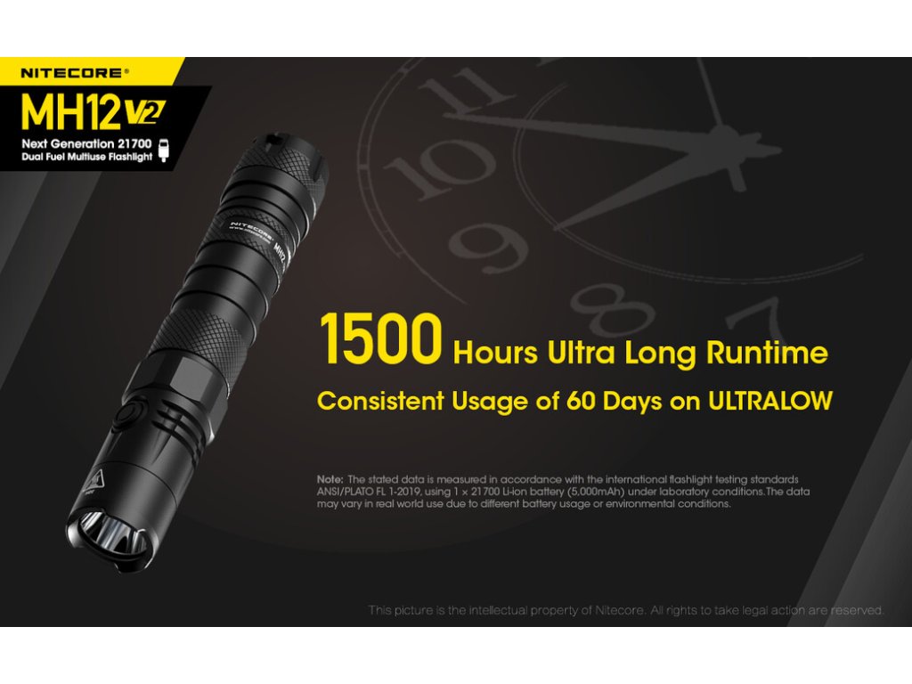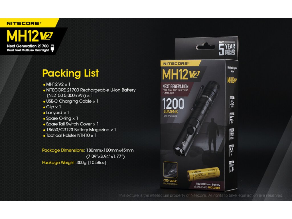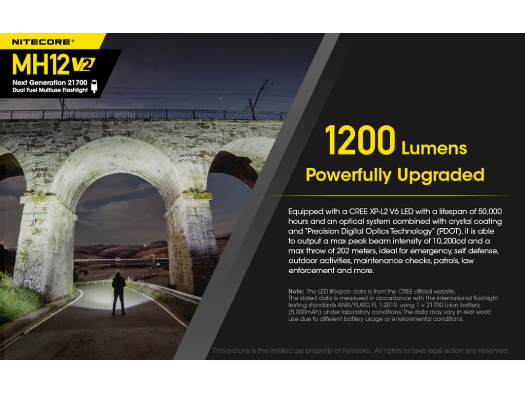 Nitecore MH12 v2 sa oproti svojmu predchodcovi pýši tým, že má trojnásobne dlhšiu výdrž a svetlo je o 20% jasnejšie, napriek tomu je rozmermi veľmi kompaktné. V hlave svietidla je osadená výkonná XP-L2 V6 LED v studenom odtieni bieleho svetla. Maximálny svetelný tok je 1200lm a dosvieti na vzdialenosť 202m. Predstavuje vrchol precízneho inžinierstva a dizajnu. Svietidlo ponúka 4 režimy svietenia: TURBO 100%,25%, 5%, 0,08% + 3 zábleskové režimy: STROBE, Maják, SOS, ktoré sa hodia v krízových situáciách. LED baterka sa ovláda zadným pogumovaným taktickým spínačom pre zapnutie/ vypnutie a bočným kovovým spínačom na hlave svietidla, pre zmenu režimov svietenia. Okolo spínača sa nachádza modrá indikačná LED, ktorá vo vypnutom stave, pri stlačení spínača bliká na modro a tak zobaruje aktuálny stav vybitia akumulátora. MH12 v2 je napájaná na 1x Li-ion 21700mAh 5000mAh akumulátor, ktorý sa nabíja priamo v tele svietidla, prostredníctvom rýchleho nabíjacieho USB-C konektora. Nabíjanie sa tak stáva hračkou doma alebo aj na cestách. Tepelne obmedzená doba svietenia (technológia ATR) na najvyššom režime svietenia TURBO 100%, chráni svietidlo pred prehriatim. Pri otimálnych vonkajších podmienkach dochládzania, dokáže na TURBO 100% režime MH12 v2, svietiť 3hod. 45min. Na Ultranízkom režime svietenia, dokáže svietiť 62dní, čo z neho robí aj fantastické núdzové svietidlo. Je tiež dobrou voľbou, ak hľadáte výkonnú LED baterku na každodenné nosenie (EDC). V balení sa nachádza aj odolné plastové púzdro, aby ste si svietidlo mohli zavesiť na opasok a mať ho stále poruke. Praktická je aj kovová spona pre zavesenie MH12 v2 na vrecko nohavíc a šnúrka na zápästie. Telo svietida je vyrobené z tvrdenej hliníkovej zliatiny HA III a spĺňa vodotesnosť podľa štandardu IPX8. Odoláva pádom z výšky 1m. Svietidlo má aj pamäť režimov. Bez ohľadu na to, či MH12 v2 chcete používať na každodenné plnenie pracovných úloh, hliadkovanie alebo pri pátracích a záchranných úlohách, MH12 v2 je nepostrádateľným spoločníkom. Je to ideálne svietidlo pre taktické využitie (vojaci/ polícia), no svoje uplatnenie nájde aj pre kempovanie, opravy v garáži, núdzové situácie, atď.