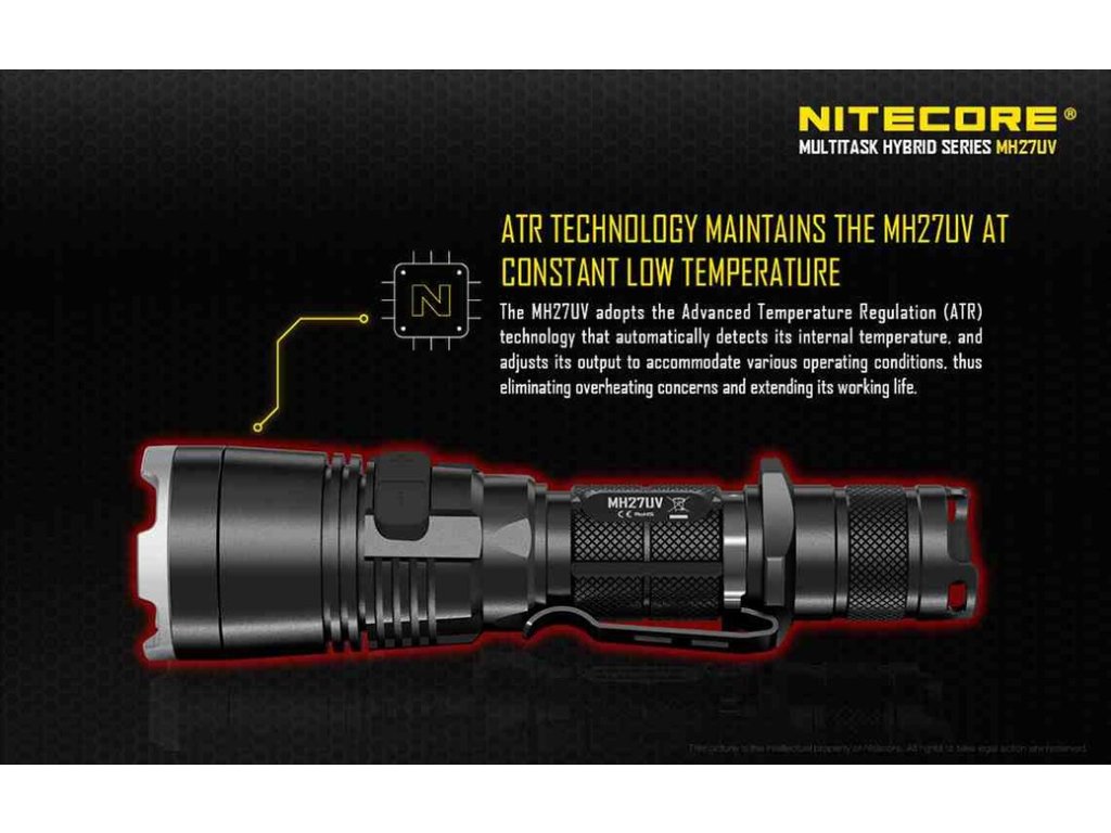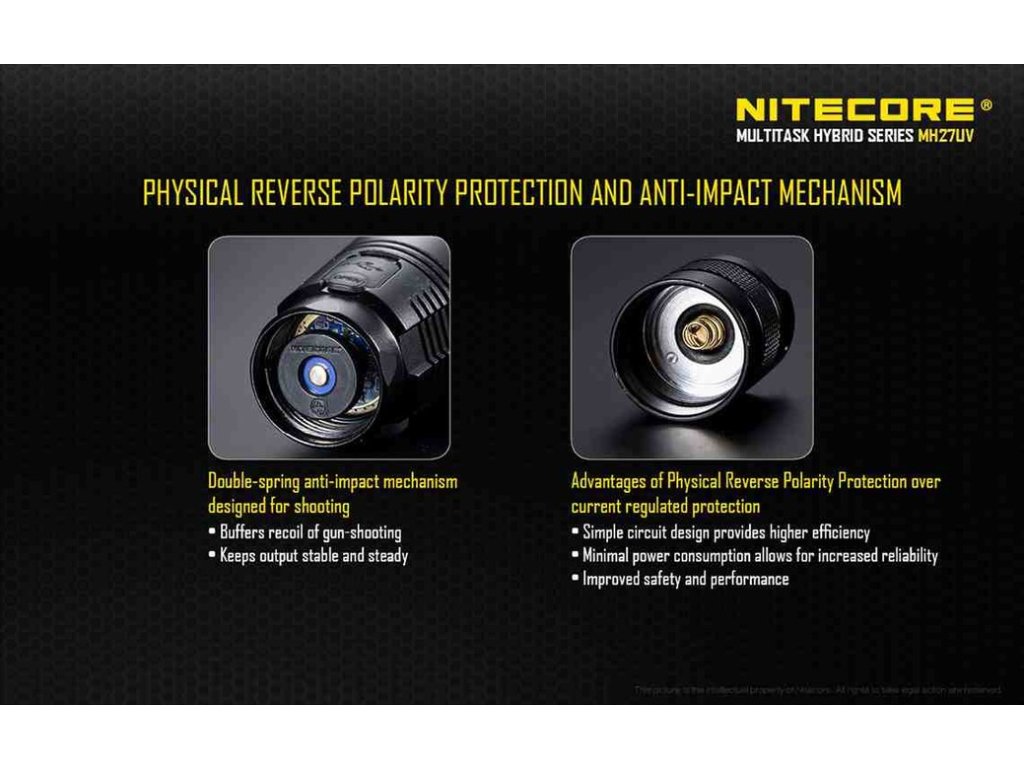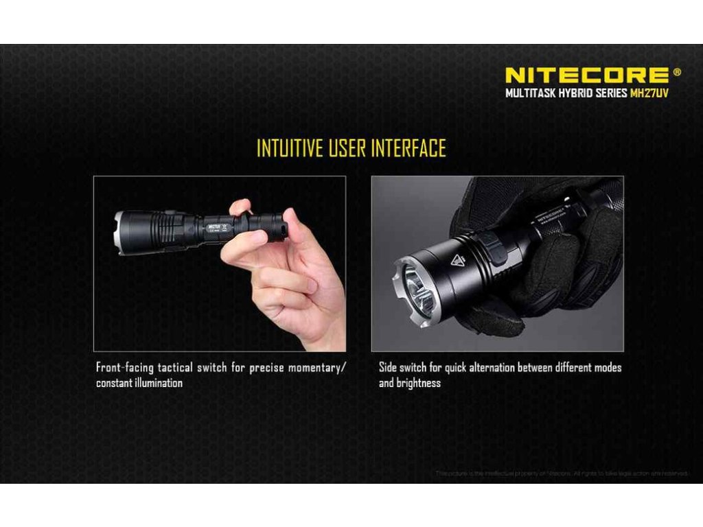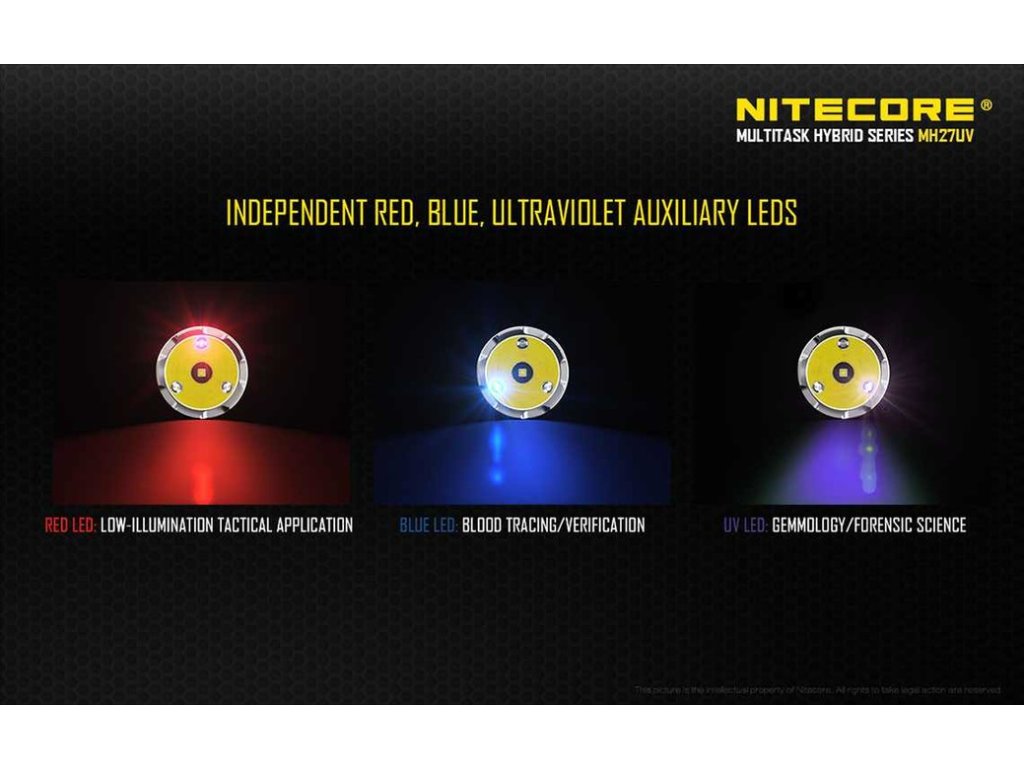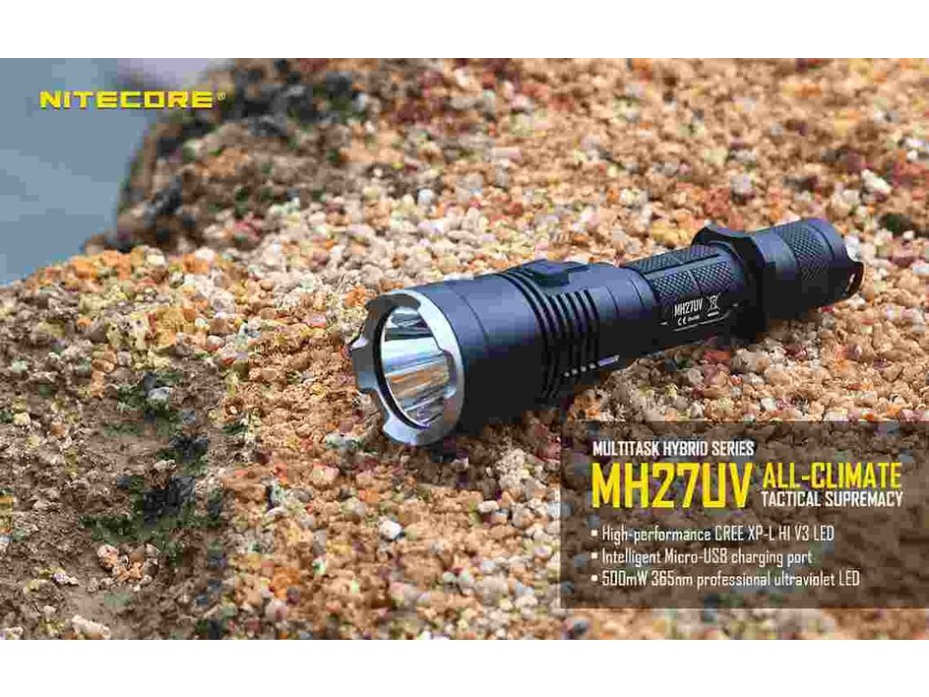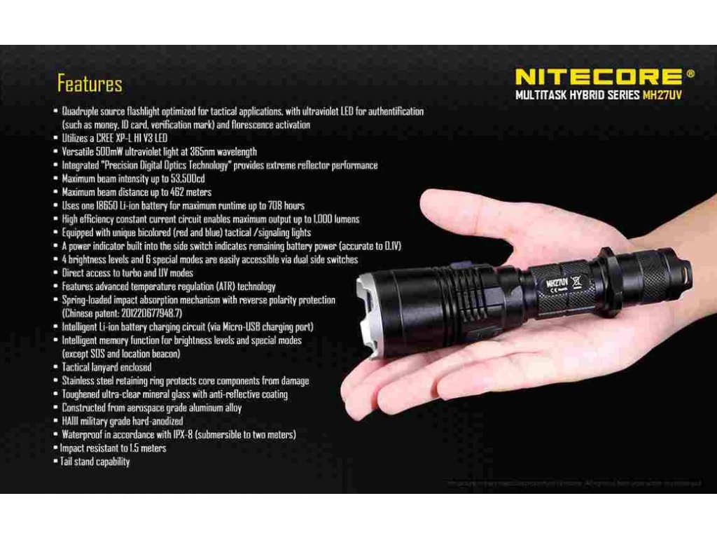 Nitecore MH séria vychádza z jednoduchého ovládania a Multi-tasku. Svietidlo sa vyznačuje jedinečnou vlastnosťou a to osadením bielej Cree XP-L HI V3 LED spolu s červenou, modrou a UV LED v jednom jedinom svietidle. Multi-task hybridy sú vybavené inteligentným nabíjacím obvodom a integrovaným portom micro USB pre nabíjanie. USB kábel je súčasťou, takže nabíjať môžete z ľubovoľného zdroja napájania USB. V novej LED baterke Nitecore MH27UV je osadená extra výkonná Cree XP-L HI V3 biela LED s maximálnym výstupom až 1000 lm a dosahom svetla 462 m. UV LED má vlnovú dĺžku 365 nm. MH27UV má sedem režimov svietenia a štyri špeciálne zábleskové režimy. Ergonomický dizajn, vodeodolná konštrukcia a pevný eloxovaný povrch zaručujú dlhú životnosť svietidla. Nitecore MH27UV je napájaný na 1x 18650 3,7V Li-Ion akumulátorom, alebo 2x CR123 3V batériou (nie je súčasť balenia). Svietidlo je schopné rýchleho a efektívneho nabíjania nabíjacieho 18650 Li-Ion 3,7V akumulátora priamo v svietidle. Toto svietidlo je priam stvorené pre taktické, ale aj poľovné účely.