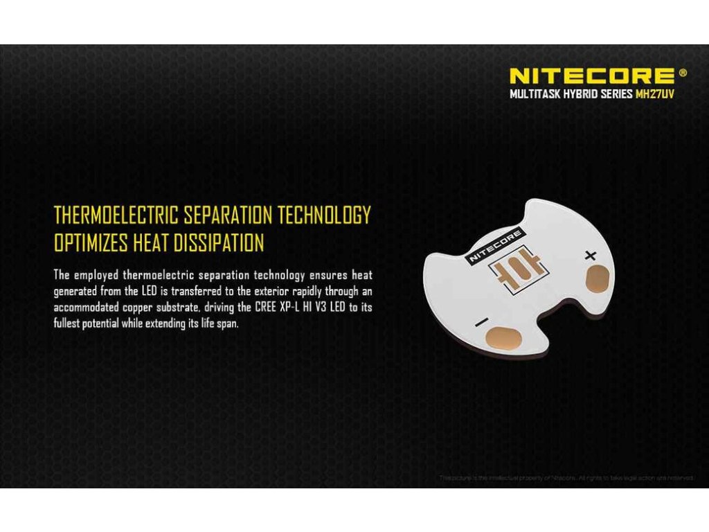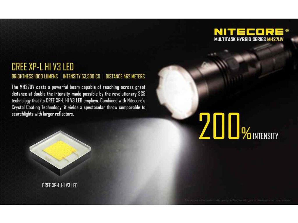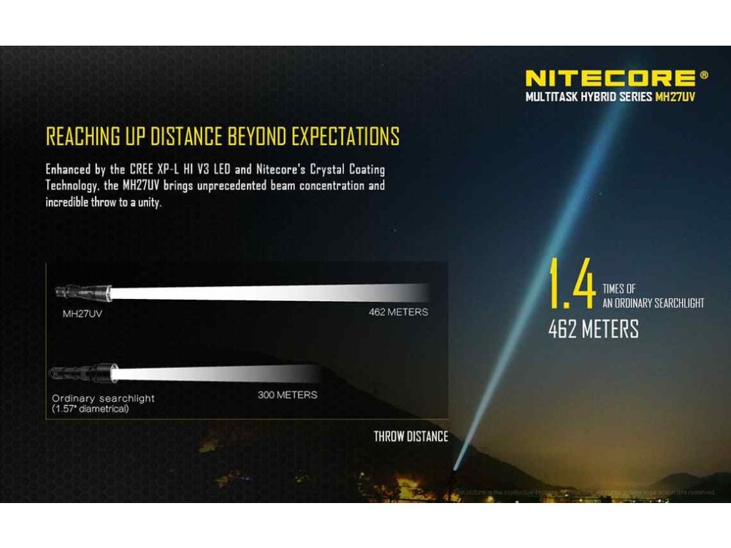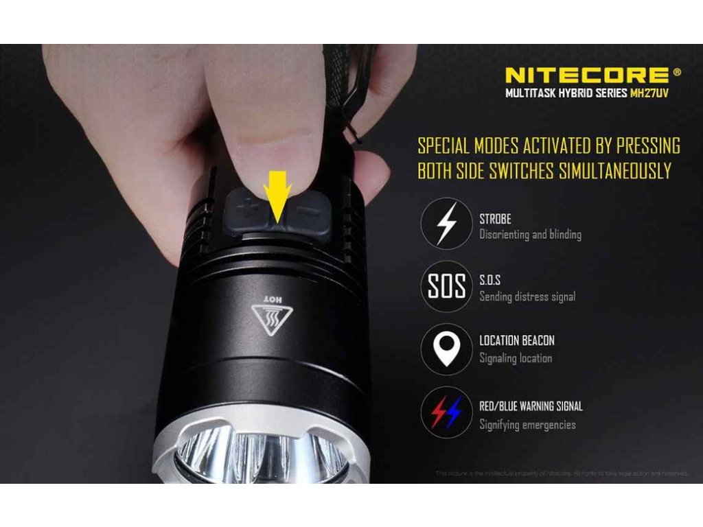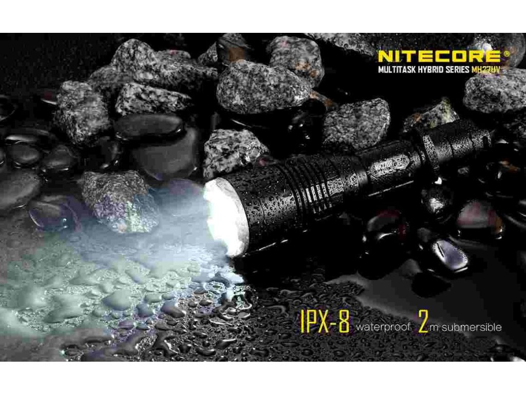 Nitecore MH séria vychádza z jednoduchého ovládania a Multi-tasku. Svietidlo sa vyznačuje jedinečnou vlastnosťou a to osadením bielej Cree XP-L HI V3 LED spolu s červenou, modrou a UV LED v jednom jedinom svietidle. Multi-task hybridy sú vybavené inteligentným nabíjacím obvodom a integrovaným portom micro USB pre nabíjanie. USB kábel je súčasťou, takže nabíjať môžete z ľubovoľného zdroja napájania USB. V novej LED baterke Nitecore MH27UV je osadená extra výkonná Cree XP-L HI V3 biela LED s maximálnym výstupom až 1000 lm a dosahom svetla 462 m. UV LED má vlnovú dĺžku 365 nm. MH27UV má sedem režimov svietenia a štyri špeciálne zábleskové režimy. Ergonomický dizajn, vodeodolná konštrukcia a pevný eloxovaný povrch zaručujú dlhú životnosť svietidla. Nitecore MH27UV je napájaný na 1x 18650 3,7V Li-Ion akumulátorom, alebo 2x CR123 3V batériou (nie je súčasť balenia). Svietidlo je schopné rýchleho a efektívneho nabíjania nabíjacieho 18650 Li-Ion 3,7V akumulátora priamo v svietidle. Toto svietidlo je priam stvorené pre taktické, ale aj poľovné účely.