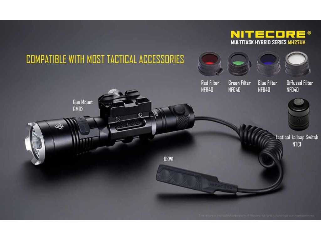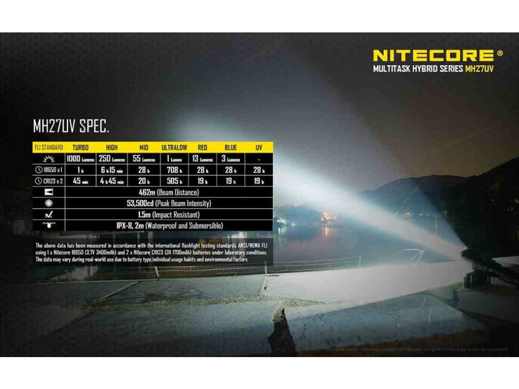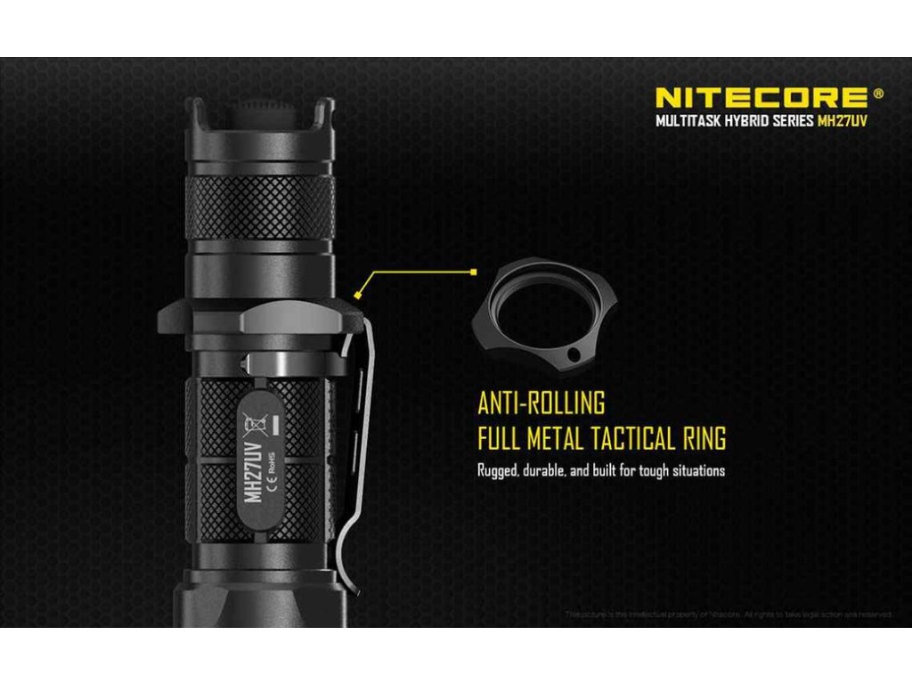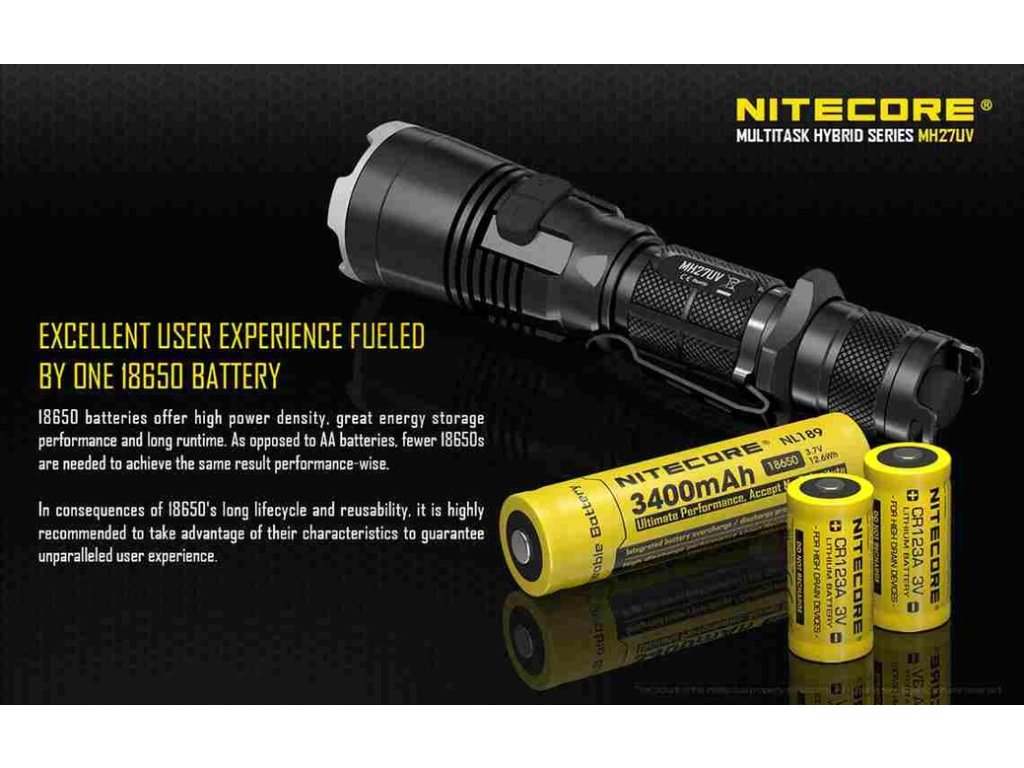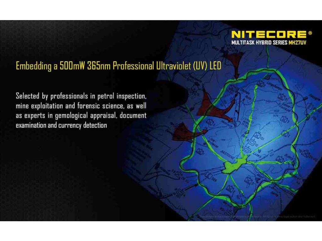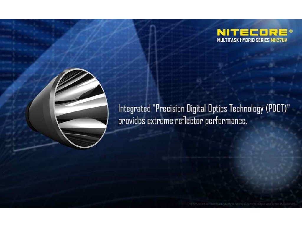 Nitecore MH séria vychádza z jednoduchého ovládania a Multi-tasku. Svietidlo sa vyznačuje jedinečnou vlastnosťou a to osadením bielej Cree XP-L HI V3 LED spolu s červenou, modrou a UV LED v jednom jedinom svietidle. Multi-task hybridy sú vybavené inteligentným nabíjacím obvodom a integrovaným portom micro USB pre nabíjanie. USB kábel je súčasťou, takže nabíjať môžete z ľubovoľného zdroja napájania USB. V novej LED baterke Nitecore MH27UV je osadená extra výkonná Cree XP-L HI V3 biela LED s maximálnym výstupom až 1000 lm a dosahom svetla 462 m. UV LED má vlnovú dĺžku 365 nm. MH27UV má sedem režimov svietenia a štyri špeciálne zábleskové režimy. Ergonomický dizajn, vodeodolná konštrukcia a pevný eloxovaný povrch zaručujú dlhú životnosť svietidla. Nitecore MH27UV je napájaný na 1x 18650 3,7V Li-Ion akumulátorom, alebo 2x CR123 3V batériou (nie je súčasť balenia). Svietidlo je schopné rýchleho a efektívneho nabíjania nabíjacieho 18650 Li-Ion 3,7V akumulátora priamo v svietidle. Toto svietidlo je priam stvorené pre taktické, ale aj poľovné účely.