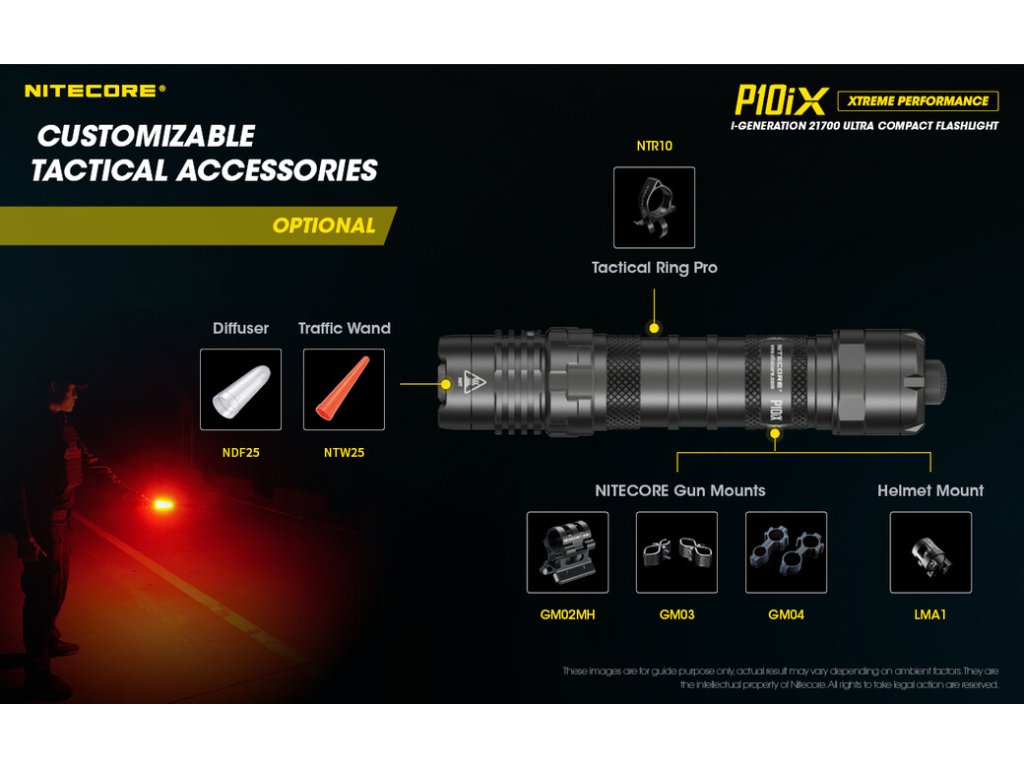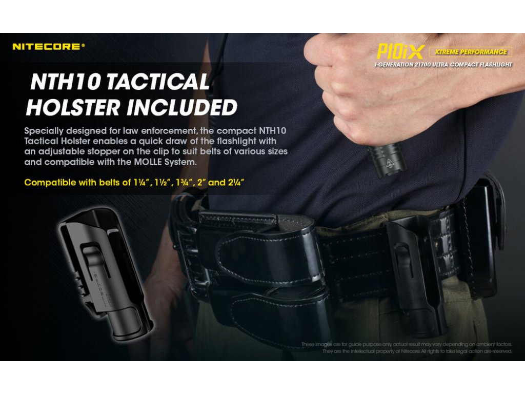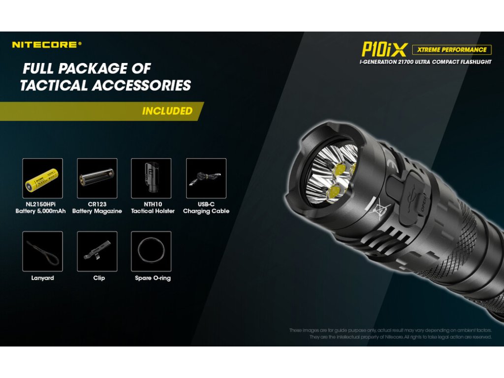Svietidlo, 1x špeciálny Li-ion akumulátor Nitecore NL2150HPi 5000mAh 3,6V, plastová redukcia na použitie 2x CR123 3V batérií/ 2x 16340 3,6-3,7V akumulátor, plastový držiak (púzdro) na svietidlo NTH10, šnúrka na zápästie, kovový klip, 1x náhradný tesniaci O-krúžok, nabíjací USB-C kábel, manuál. Balenie obsahuje akumulátor/ batériu.