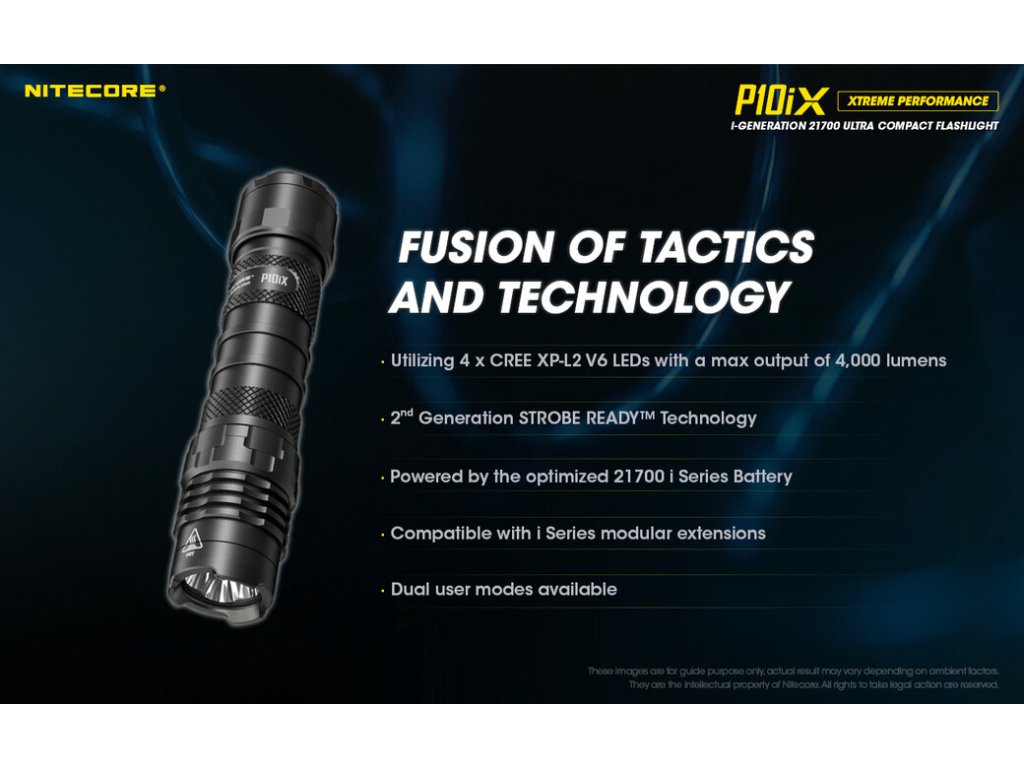 NITECORE P10iX je bezkonkurenčná taktická LED baterka, pokiaľ ide o výkon a kompaktné rozmery! Nitecore prevzal obľúbený vzhľad a telo zo svietidla P10i a tým si P10iX zachovalo spomínanú kompaktnú veľkosť, ergonómiu a má zdvojnásobený svetelný výkon, osadených 4x CREE XP-L2 V6 v studenej farbe svetla. Táto extrémne silná LED baterka, vyžaruje maximálny svetelný lúč 4000lm, ktoré svieti na vzdialenosť až 158m. Na maximálny svetelný výkon TURBO100%, dokáže nepretržite pracovať pri otimálnych teplotných podmienkach (ATR tepelná ochrana) 30min. Verili by ste, že všetka tá sila sa zmestí do tak kompaktnej LED baterky? Neexistuje žiadna podobná náhrada s tak vysokým svetelným tokom. P10iX je súčasťou Nitecore iSeries a ako zdroj energie využíva špeciálny inteligentný obojpólový 1x Li-ion akumulátor 21700 NL2150HPi s kapacitou 5000mAh a vybíjacím prúdom 15A. Je špeciálne navrhnutý pre toto svietidlo. Umožňuje maximálny svetelný výstup s vyššou účinnosťou a minimalizuje stratu energie. Maximálna dobu chodu 350hod. pri nízkej úrovni svietenia 2lm 0,05%. Rýchle nabíjanie špeciálneho 1x Li-ion akumulátora 21700 v tele svietidla P10iX, prebieha cez vstavaný USB-C port. Nitecore P10iX je možné napájať aj jednorázovými 2x CR123A 3V batériami, vďaka plastovej redukcii v balenín, ale maximálny svetelný výkon bude iba 1060lm! Tak isto budú poznižované výkony aj ostatných režimov svietenia (viď. tabulka v obrázkoch)! Svietidlo je navrhnuté hlavne pre políciu, vojenské zložky a bezpečnostné služby. Vychutnajte si okamžitý nábeh do Turbo 100% režimu svietenia alebo okamžitý prístup k zábleskovému režimu STROBE, pomocou 2 tlačidiel zadného taktického spínača s funkciou STROBE READY. P10iX ponúka 6 režimov svietenia: TURBO100%, 43%, 21%, 8%, 1%, 0,05% + 1 zábleskový režim STROBE s nelineárnou zábleskovou frekvenciou. Režimy meníte krátkymi stláčaniami tlačidla režimu MODE, keď je svietidlo v zapnutom stave. Pamäť režimu svietenia zaisťuje to, že sa po opätovnom zapnutí LED baterky, rozsvieti v poslednom zvolenom režime svietenia. Nelineárne STROBE, spôsobuje zosilnené zábleskové efekty (mení intenzitu blikania), ktoré sú vysoko efektívne, napr. pri sebaobrane. Na výber máte z 2 používateľských módov: Všeobecný a Taktický. Každý z módov má špecifické režimy pre daný mód (viď. tabulka v obrázkoch). Súčasťou balenia je pevné plastové púzdro na opasok NTH10, ktoré je kompatibilné s pracovnými opaskami a so systémami MOLLE. Svietidlo má vodeodolnosť podľa štandardu IP68 a odoláva nárazom z výšky 2m. P10iX je ideálnou voľbou pre bezpečnostné zložky, políciu alebo aj bežných ľudí, ktorý si potrpia na extrémnom výkone a kompaktných rozmeroch.