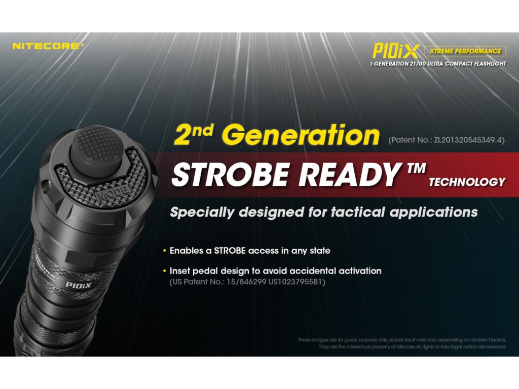 • Taktický režim: Keď svietidlo svieti, dlho stlačte tlačidlo režimu MODE (STROBE READY™), aby ste sa dostali do zábleskového režimu STROBE. Krátkym stlačením tlačidla režimu (STROBE READY™) sa vrátite do predchádzajúceho stavu alebo kliknutím na tlačidlo napájania (okrúhle tlačidlo) vypnete svietidlo. (Tento prístup si nezapamätá režim STROBE.)