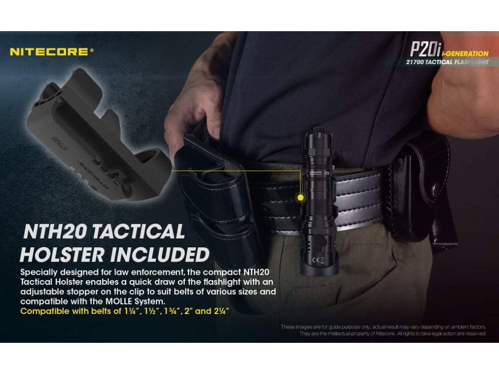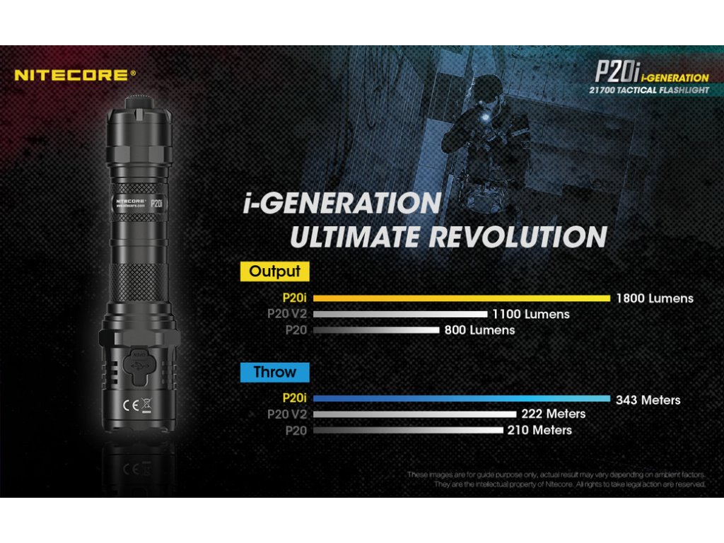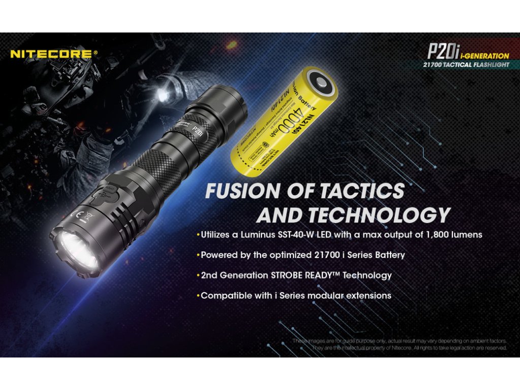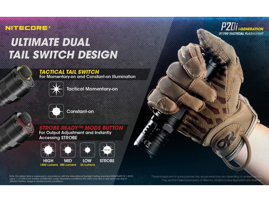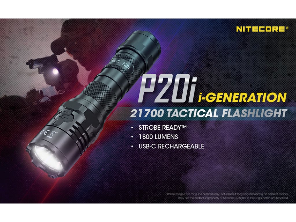 Taktická LED baterka Nitecore P20i sa pýši vysokým výkonom 1800lm a dosahom svetla 343m. V hlave svietidla je osadená výkonná Luminus SST-40-W LED v dennom odtieni bieleho svetla. Na hlave svietidla sa nachádza aj integrovaný indikátor napájania, ktorý včas upozorní, na vybíjajúci sa akumulátor/ batériu. Je určená pre orgány činné v trestnom konaní a ozbrojené zložky. Svietidlo zaujme svojou ultra silnou údernou lunetou, ktorá dobre padne pri potrebe rozbitia skla alebo sebaobrane. P20i ponúka 3 svetelné režimy: TURBO 100%, 16%, 2% + 1 zábleskový režim STROBE. Tento zábleskový režim, spôsobuje oslnenie protivníka. Vďaka použitej vnútornej elektronike je svietidlo prispôsobené na 1x Li-ion akumulátor 21700 a s použitím priloženého plastového adaptéra, aj na jednorázové 2x CR123A 3V batérie (nenabíjajte ich v svietidle!!). Súčasťou balenia je 1x Li-ion 21700 4000mAh 3,6V akumulátor, ktorý sa nabíja priamo v tele svietidla, prostredníctvom rýchleho USB-C konektora. Ten sa nachádza pod gumenou krytkou na hlave svietidla. Doba nepretržitej prevádzky na 100% Turbo režime je 1hod. 30min. a na najnižšom režime svietenia, dokáže nepretržite pracovať 38hod. Telo svietidla je vyrobené z tvrdeného leteckého hliníka. Spĺňá vodeodolný parameter IP68 a odoláva pádom z výšky 1m. Ovládanie svietidla prebieha pomocou zadného taktického spínača, zloženého z 2 tlačidiel - okrúhleho zap/ vyp a pozdĺžneho, slúžiaceho pre zmenu režimov MODE. Vďaka technológii zadného taktického spínača, ste pripravený použiť zábleskový režim STROBE kedykoľvek, jednoduchým stlačením a podržaním tlačidla MODE. Krátkymi stlačeniami tlačidla MODE, prepínate aj režimy svietenia. Obsahom balenia je aj taktické plastové púzdro NTH20, ktoré je kompatibilné so štandardnými policajnými bezpečnostnými opaskami a systémami MOLLE, čo z neho robí ideálnu voľbu pre bezpečnostné, policajné a vojenské zložky. Prekvapenie v službe, môže byť nebezpečné, no s P20i buďte pripravený na čokoľvek!