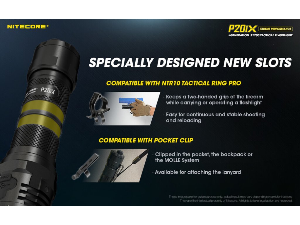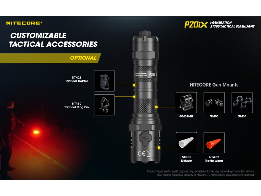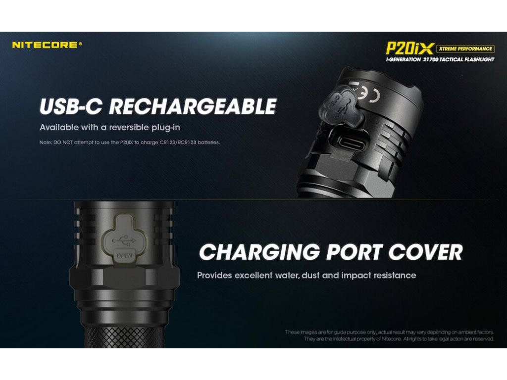 - Vhodné akumulátory/ batérie: 1x špeciálne navrhnutý Li-ion Nitecore 21700 5000mAh/ 2x jednorázová CR123A 3V batéria