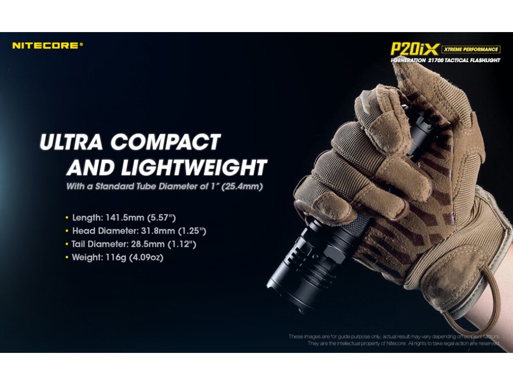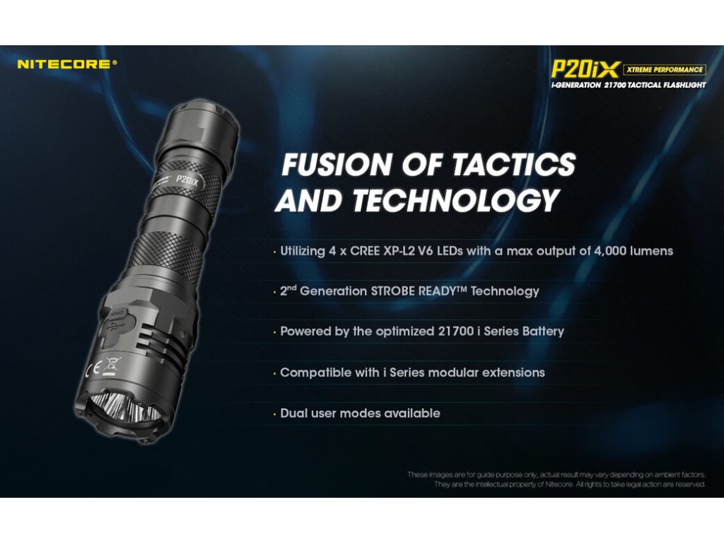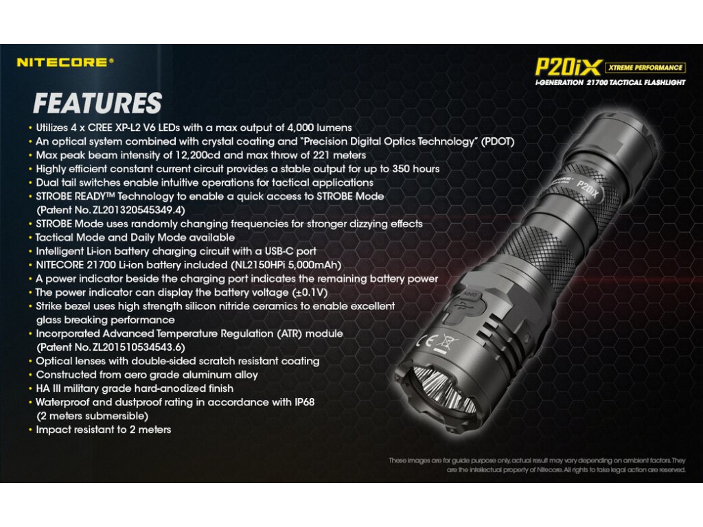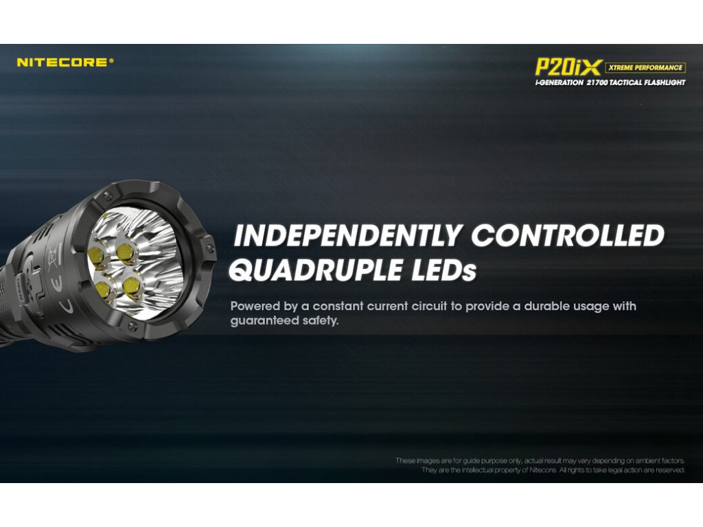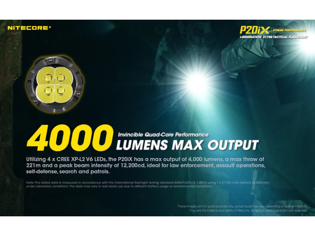 NITECORE P20iX je bezkonkurenčná LED ručná baterka, pokiaľ ide o výkon! Nitecore P20iX prevzala obľúbené telo z P20i a zachovala si tak kompaktnú veľkosť, ergonómiu a zdvojnásobila výkon, vďaka osadeným 4x CREE XP-L2 V6 LED. Táto extrémne silná LED baterka, vydáva svetelný výkon 4000lm, ktorý dosvieti na vzdialenosť 221m. P20iX je súčasťou iSeries od spoločnosti Nitecore a používa špeciálny a inteligentný Li-ion akumulátor 21700, navrhnutý špeciálne pre toto svietidlo! Ten umožňuje vysoko efektívny svetelný výstup, ktorý poskytuje po dobu 30min. 4000lm (pri optimálnych tepelných podmienkach-ATR tepelná regulácia). Maximálna doba prevádzky je 350hod. pri nízkej úrovni svietenia. Rýchle nabíjanie 1x špeciálneho Li-ion akumulátora 21700 v tele svietidla P20iX, prebieha cez vstavaný USB-C port. P20iX môže byť napájané aj na 2x CR123A 3V batériami, ako záložný zdroj energie (Pozor: Nedá sa použiť TURBO100% režim svietenia a aj ostatné režimy svietenia sú veľmi nízke). Nenabíjajte ich v svietidle!! Na hlave svietidla sa nachádza aj integrovaný indikátor napájania, ktorý včas upozorní, na vybíjajúci sa akumulátor. Svietidlo je navrhnuté pre políciu a ozbrojené zložky. Vychutnajte si okamžité TURBO100%, okamžité STROBE Ready, 6 režimov svietenia a 2 používateľské módy Taktický a Denný. Nič nemôže zadržať P20iX, keď preniká cez sklo, oceľovým prstencom s nitridovanými sklenenými vložkami. Súčasťou balenia je aj taktické plastové púzdro NTH20, ktoré je kompatibilné s pracovnými opaskami a systémami MOLLE. Telo svietidla je vyrobené z tvrdeného leteckého hliníka. Spĺňá vodeodolný parameter IP68 a odoláva pádom z výšky až 2m. Ovládanie svietidla prebieha pomocou patentovaného zadného taktického spínača, zloženého z 2 tlačidiel - okrúhleho pre zap/ vyp a pozdĺžneho MODE, slúžiaceho pre zmenu režimov svietenia. Vďaka technológii patentovaného zadného taktického spínača, ste pripravený použiť zábleskový režim STROBE kedykoľvek, jednoduchým stlačením a podržaním tlačidla MODE. P20iX je ideálnou voľbou pre bezpečnostné, policajné alebo vojenské zložky.