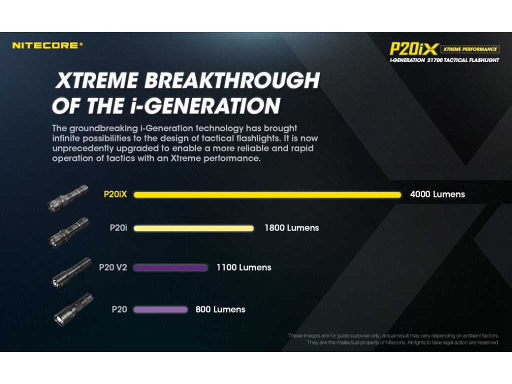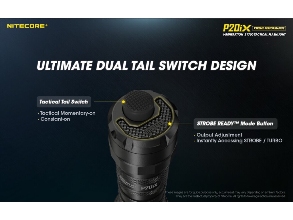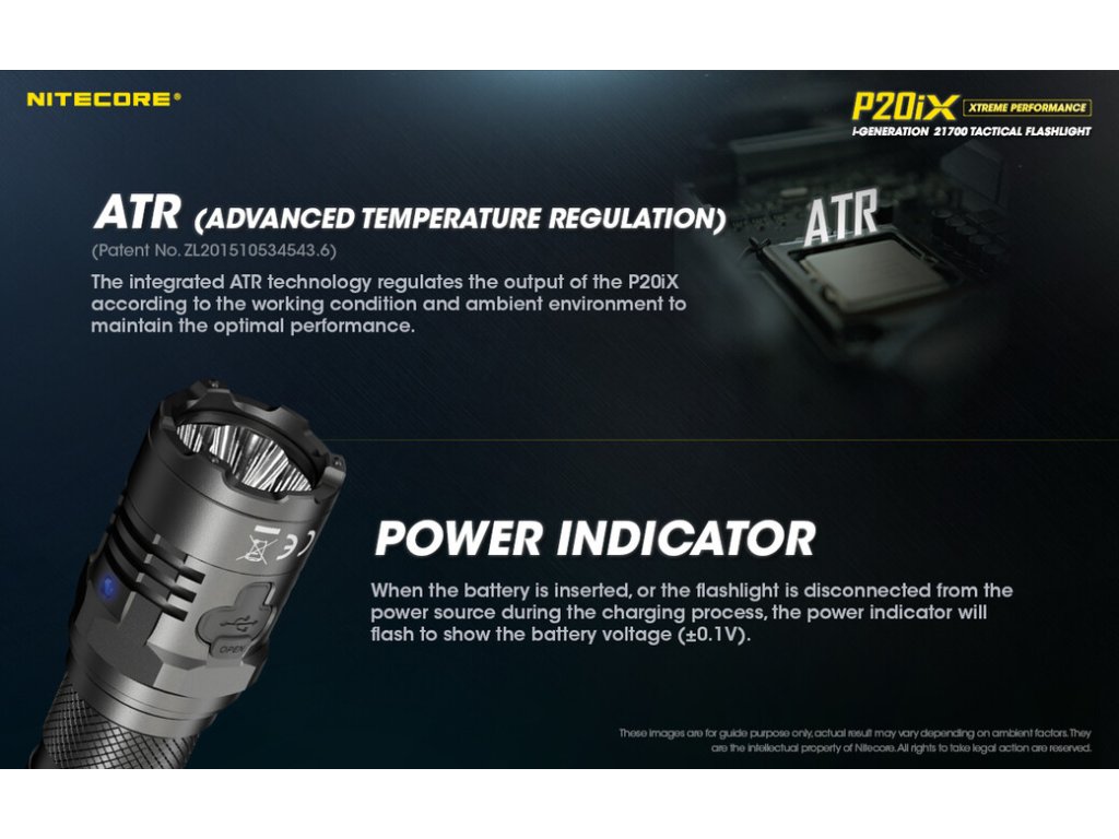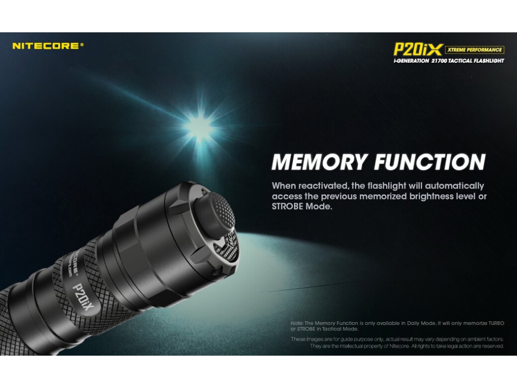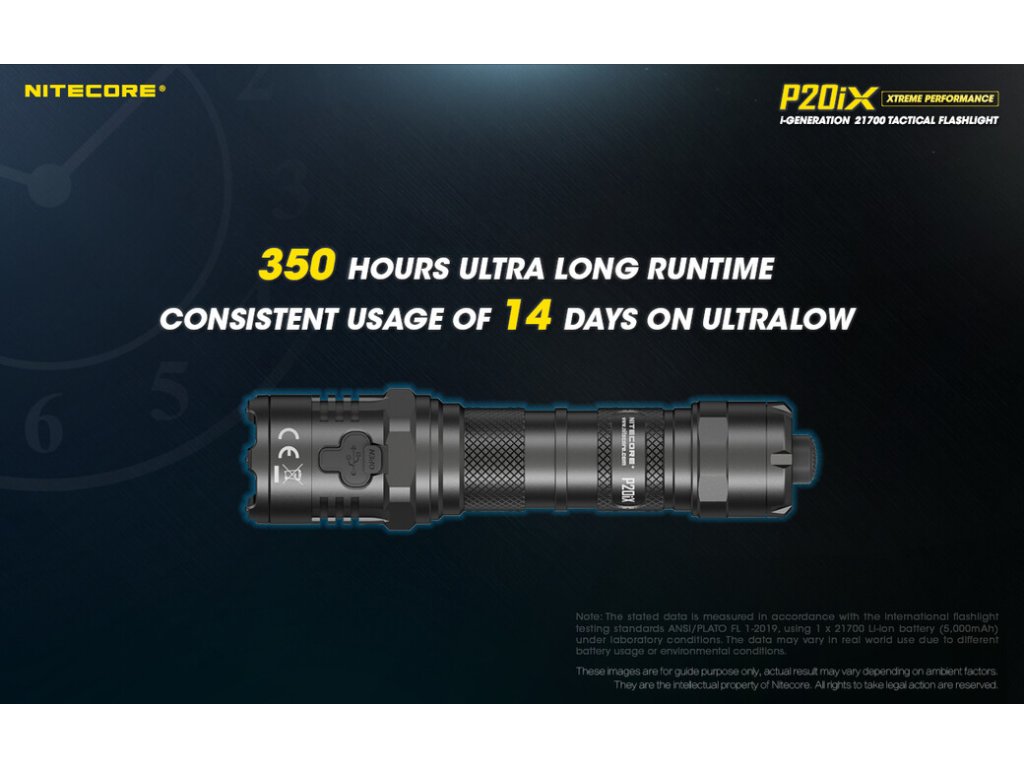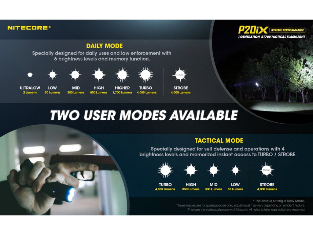 NITECORE P20iX je bezkonkurenčná LED ručná baterka, pokiaľ ide o výkon! Nitecore P20iX prevzala obľúbené telo z P20i a zachovala si tak kompaktnú veľkosť, ergonómiu a zdvojnásobila výkon, vďaka osadeným 4x CREE XP-L2 V6 LED. Táto extrémne silná LED baterka, vydáva svetelný výkon 4000lm, ktorý dosvieti na vzdialenosť 221m. P20iX je súčasťou iSeries od spoločnosti Nitecore a používa špeciálny a inteligentný Li-ion akumulátor 21700, navrhnutý špeciálne pre toto svietidlo! Ten umožňuje vysoko efektívny svetelný výstup, ktorý poskytuje po dobu 30min. 4000lm (pri optimálnych tepelných podmienkach-ATR tepelná regulácia). Maximálna doba prevádzky je 350hod. pri nízkej úrovni svietenia. Rýchle nabíjanie 1x špeciálneho Li-ion akumulátora 21700 v tele svietidla P20iX, prebieha cez vstavaný USB-C port. P20iX môže byť napájané aj na 2x CR123A 3V batériami, ako záložný zdroj energie (Pozor: Nedá sa použiť TURBO100% režim svietenia a aj ostatné režimy svietenia sú veľmi nízke). Nenabíjajte ich v svietidle!! Na hlave svietidla sa nachádza aj integrovaný indikátor napájania, ktorý včas upozorní, na vybíjajúci sa akumulátor. Svietidlo je navrhnuté pre políciu a ozbrojené zložky. Vychutnajte si okamžité TURBO100%, okamžité STROBE Ready, 6 režimov svietenia a 2 používateľské módy Taktický a Denný. Nič nemôže zadržať P20iX, keď preniká cez sklo, oceľovým prstencom s nitridovanými sklenenými vložkami. Súčasťou balenia je aj taktické plastové púzdro NTH20, ktoré je kompatibilné s pracovnými opaskami a systémami MOLLE. Telo svietidla je vyrobené z tvrdeného leteckého hliníka. Spĺňá vodeodolný parameter IP68 a odoláva pádom z výšky až 2m. Ovládanie svietidla prebieha pomocou patentovaného zadného taktického spínača, zloženého z 2 tlačidiel - okrúhleho pre zap/ vyp a pozdĺžneho MODE, slúžiaceho pre zmenu režimov svietenia. Vďaka technológii patentovaného zadného taktického spínača, ste pripravený použiť zábleskový režim STROBE kedykoľvek, jednoduchým stlačením a podržaním tlačidla MODE. P20iX je ideálnou voľbou pre bezpečnostné, policajné alebo vojenské zložky.