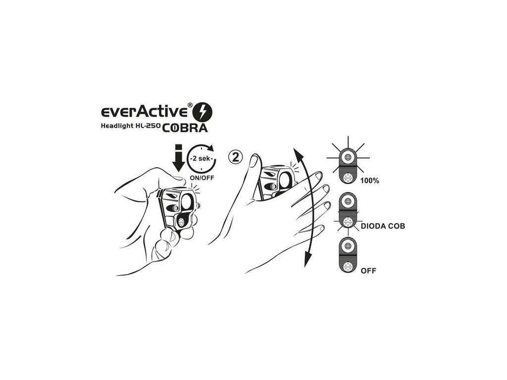 Zapnutie/ vypnutie IR senzora svietenia - Pre zapnutie IR senzora, stlačte čierny spínač z vrchnej strany tela čelovky, podržaním spínača na cca 2sek. Z vnútra čelovky preblikne 3x červená indikačná LED, ktorá značí aktiváciu IR senzora. Následne už len stačí cyklicky mávať rukou hore a dolu pred čelovkou a režimy svietenia sa prepínajú pri každom mávnutí v nasledovných jednotlivých krokoch: 100% Cree LED, 100% COB LED. Zbytné režimy, nie sú aktívne. Deaktivácia senzora sa vykonáva opätovným stlačením spínač z hornej strany tela čelovky a jeho podržaním na cca 2sek.