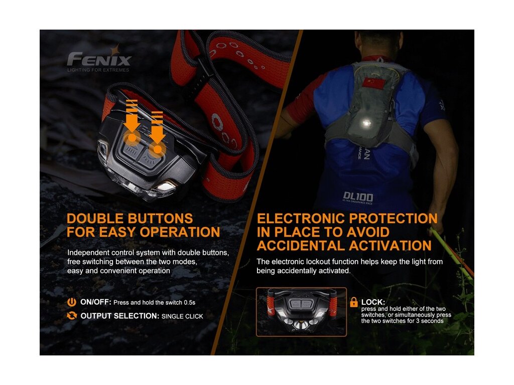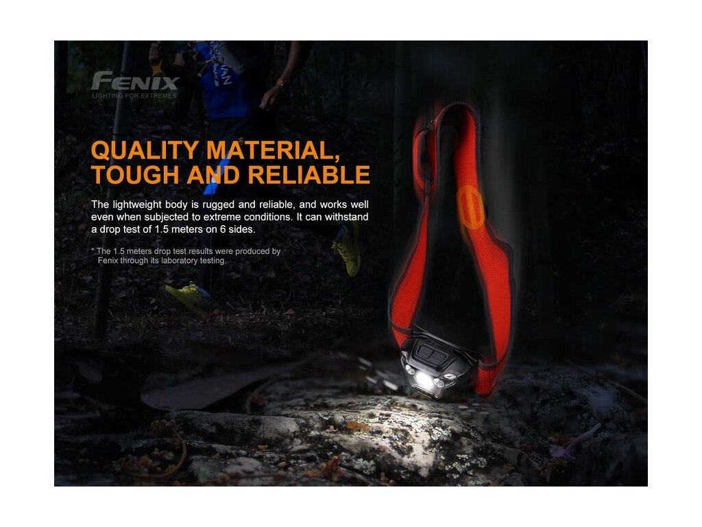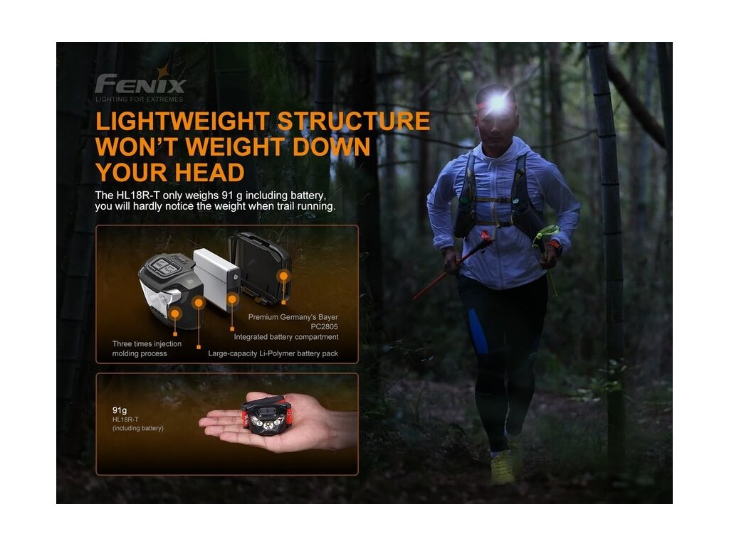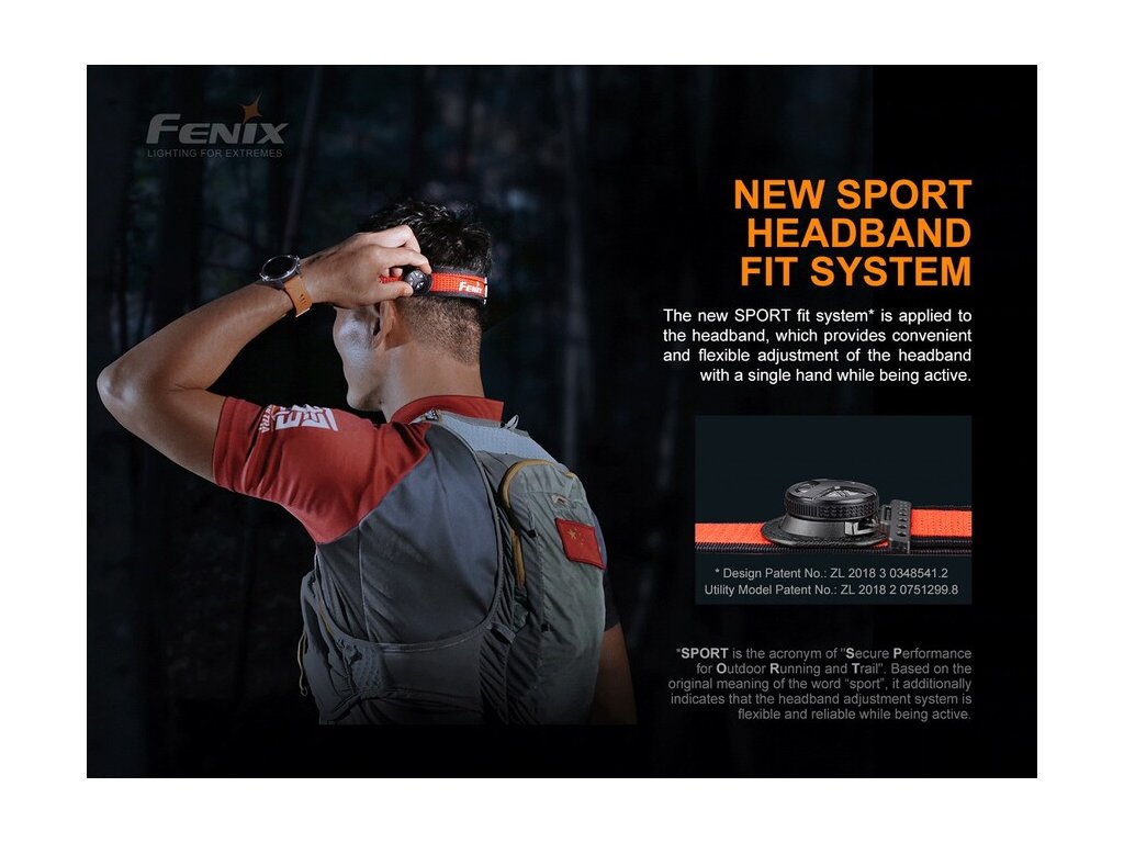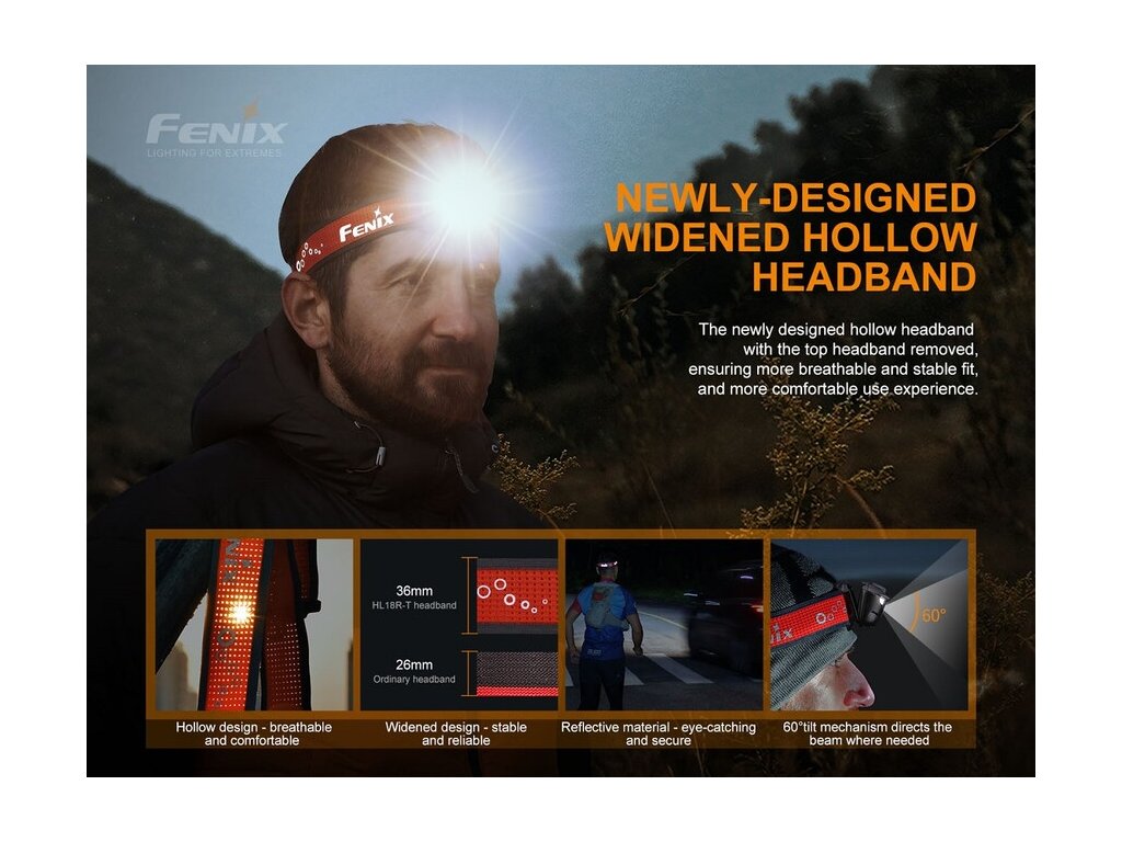 Čelovka je opatrená širokým popruhom s novým Sport Fit Systémom s jedným rotačným kolieskom pre jednoduché nastavenie dĺžky popruhu. Na hlave tak čelovku jednou rukou rýchlo a pohodlne utiahnete. Popruh je tiež perforovaný a opatrený reflexnými prvkami, ktoré zaisťujú pasívnu viditeľnosť pri behu po ceste. Vďaka váhe iba 91 gramov, tak Fenix HL18R-T dobre poslúži ako bežecká čelovka aj ako čelovka na kempovanie, turistiku a iné outdoorové aktivity.