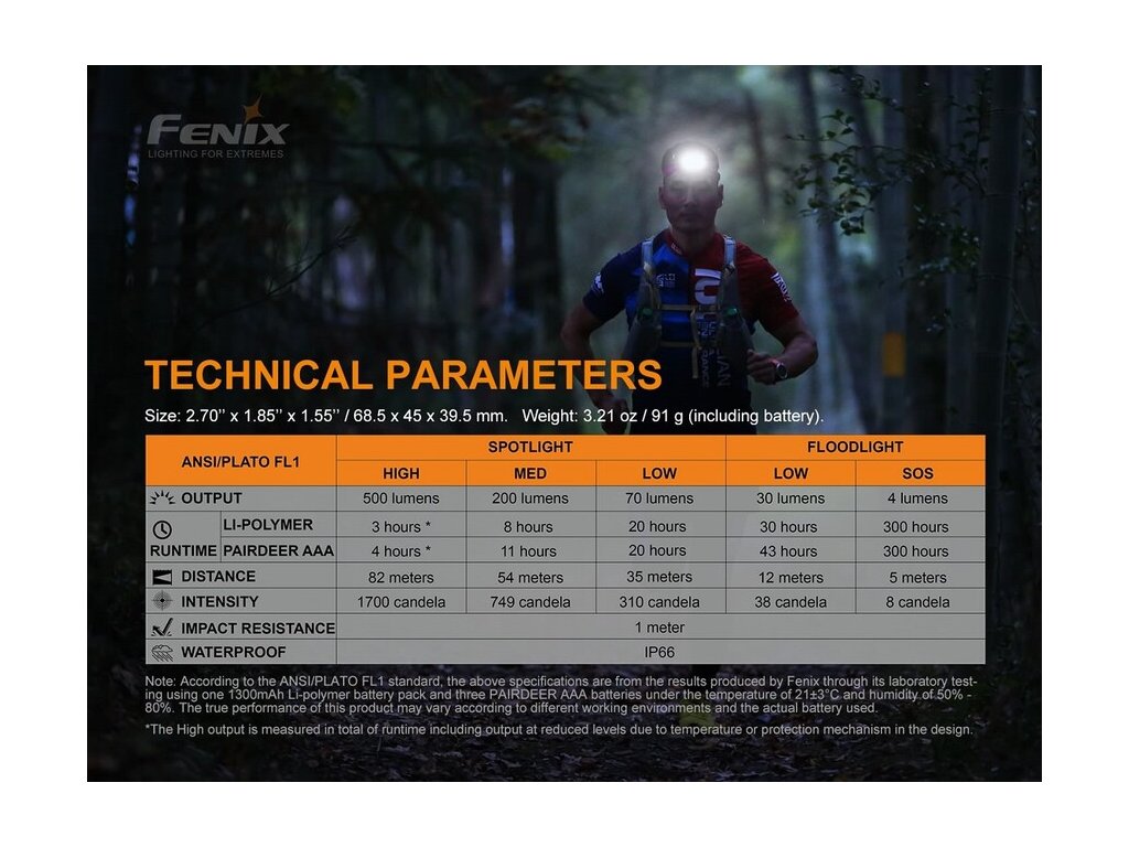- Doba svietenia: S použitím 3x AAA batérie: - Režimy hlavného reflektora: 100% 500 lúmenov (4 hodiny) -> 40% 200 lúmenov (11 hodín) -> 14% 70 lúmenov (20 hodín)// Režimy doplnkových LED so širokým kužeľom: 100% 30 lúmenov (43 hodín) -> SOS blikanie 4 lúmeny (300 hodín)