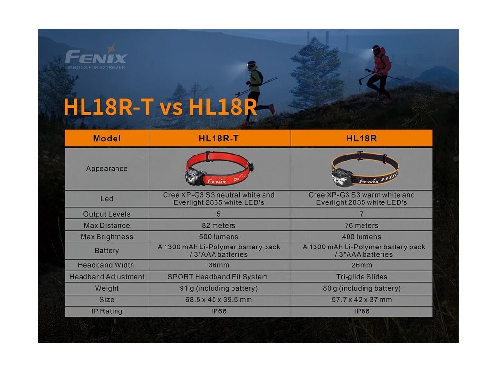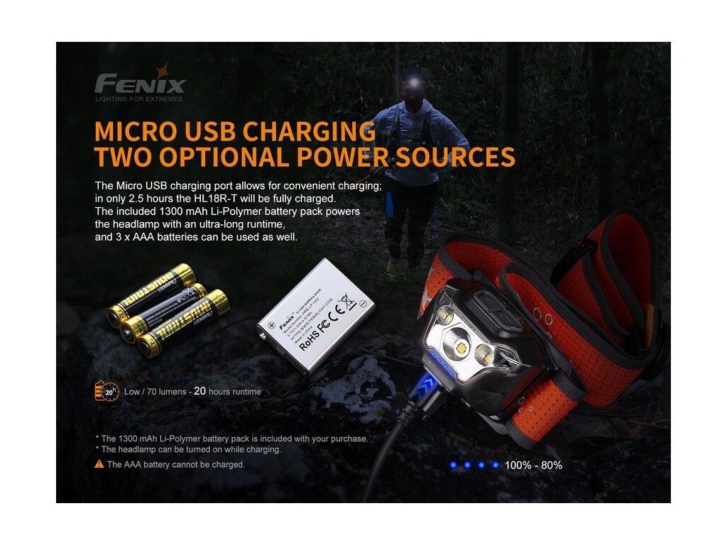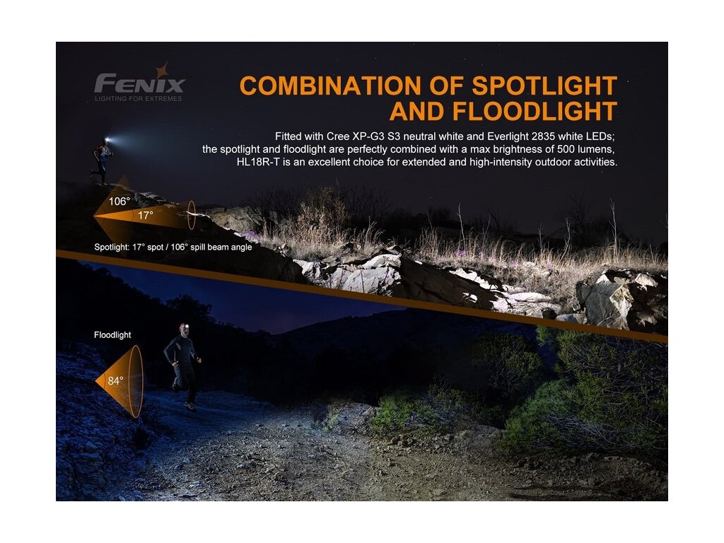 Kompaktná nabíjateľná čelovka Fenix HL18R-T prináša svetelný tok až 500 lúmenov (ANSI) a dosvit až 82 metrov. Napájanie zabezpečuje vymeniteľný lítium-polymérový akumulátor s kapacitou 1300mAh, ktorý sa nabíja cez Micro-USB konektor, priamo v čelovke. Akumulátor je možné vybrať a v núdzi nahradiť tromi bežnými batériami AAA (nedajú sa v čelovke nabíjať). Zdrojom svetla je moderná LED Cree XP-G3 s neutrálnym odtieňom svetla, ktorá je umiestnená v hlavnom reflektore. K doplnkovému svietenie slúžia dve biele LED Everlight 2835, ktoré vytvárajú široký a veľmi plynulý kužeľ svetla.