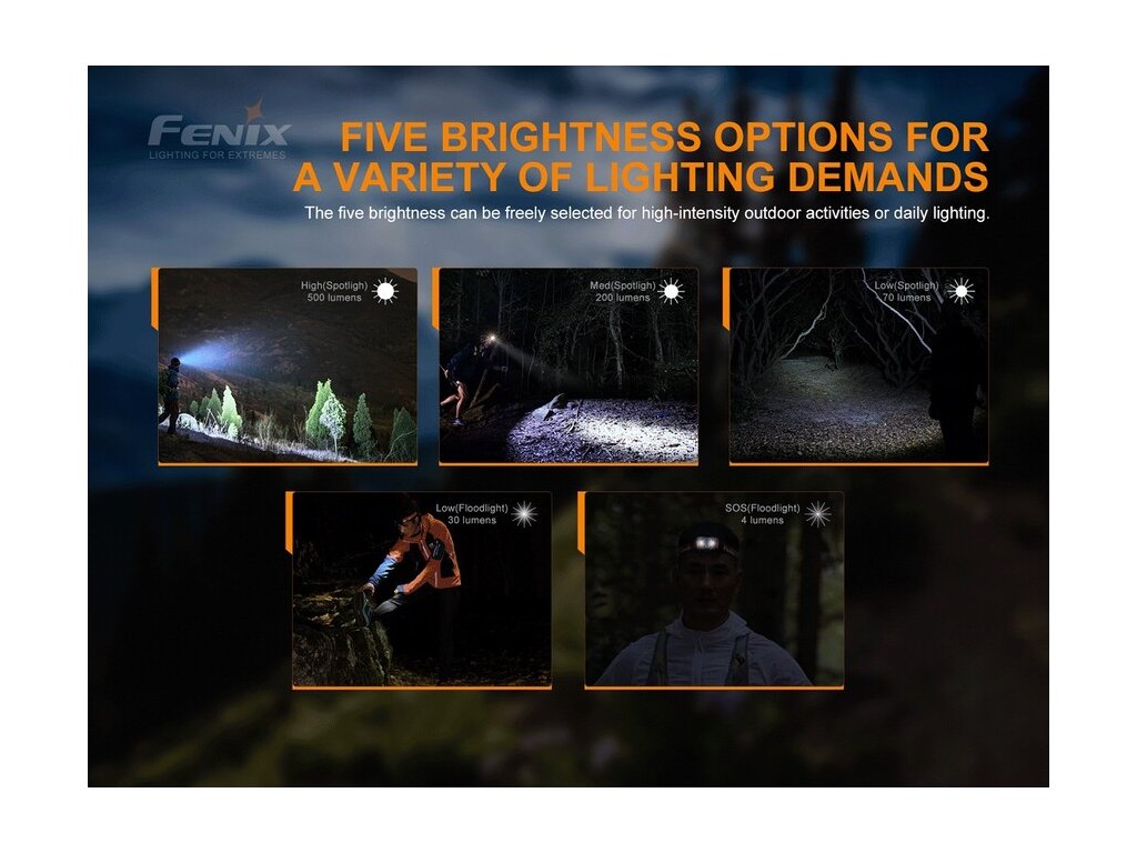 K dispozícii je celkom 5 režimov výkonu, vrátane zábleskového režimu SOS pre krízové situácie. Čelovka je tiež vybavená inovovanou funkciou predĺženia výdrže. Pri dlhšom použití jednotlivých svetelných režimov, čelovka postupne znižuje výkon v malých krokoch pre dosiahnutie dlhšej doby svietenia. Zníženie výkonu, však nie je tak výrazné, ako u staršej čelovky HL18R.