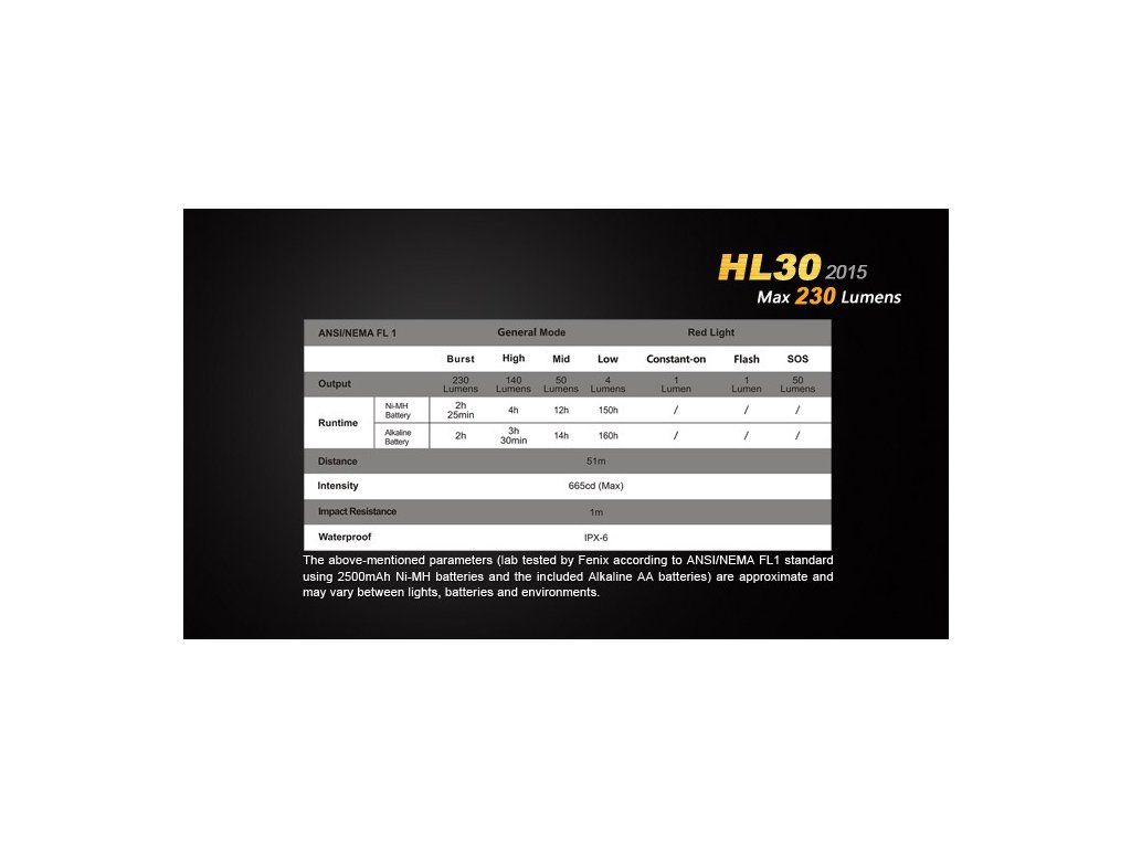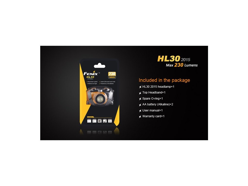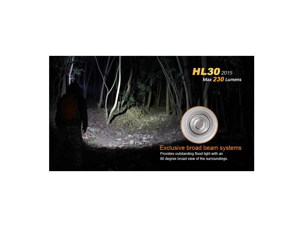 Druhá generácia čelovky Fenix HL30 je osadená diódou Cree XP-G2 a prináša svetelný tok až 230 lúmenov (ANSI). Napájanie zabezpečujú dve tužkové batérie, ktoré sa umiestňujú dovnútra čelovky. K dispozícii je celkom 7 režimov výkonu vrátane SOS pre použitie v núdzových situáciách a červeného svetla, ktoré nerušia adaptáciu očí na tmu. V najnižšom režime 4 lumeny, vydrží HL30 svietiť až 160 hodín (takmer 7 dní). Vďaka elektronike s digitálne konštantnou reguláciou, svetelný výkon pri pozvoľnom vybíjaní batérií neklesá a zostáva stále rovnaký, až do ich úplného vybitia. Ďalšou prednosťou čelovky je aj dobrá vodeodolnosť zodpovedajúca štandardu IPX-6. Špeciálny kolimátor vytvára široký svetelný kužeľ s dosvitom 51 metrov, Fenix HL30 tak výborne poslúži, ako bežecká čelovka, čelovka na kempovanie i turistiku a červenú LED iste ocenia astronómovia.