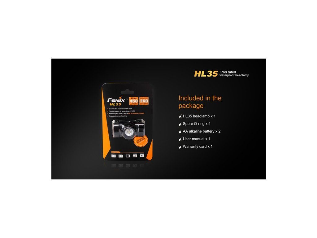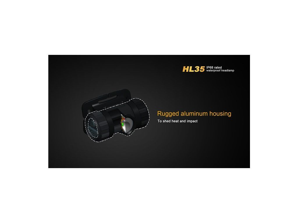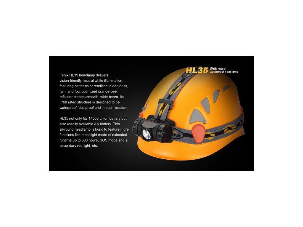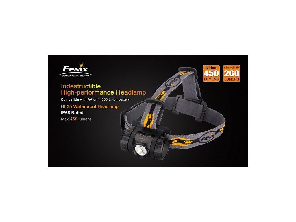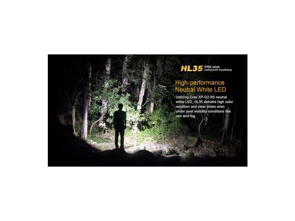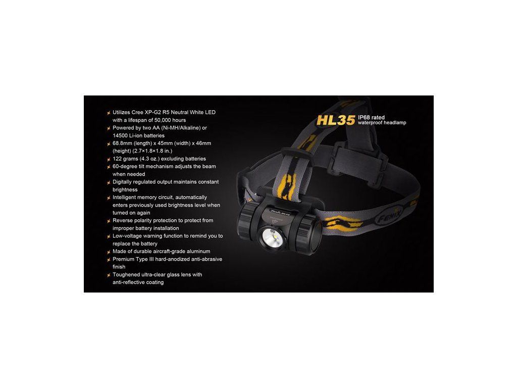 Výkonná čelovka Fenix HL35 je osadená diódou Cree XP-G2 R5 s teplejším odtieňom svetla a prináša svetelný tok až 450 lúmenov (ANSI) v BURST režime. Na napájanie je možné použiť dve klasické tužkové AA batérie (jednorazové aj nabíjacie) alebo dva Li-ion akumulátory typu 14500. Robustná celokovová konštrukcia čelovky zaisťuje optimálne chladenie a zároveň je nárazuvzdorná, vodotesná až 2 metre pod vodu aj prachotesná (podľa normy IP68). K dispozícii je celkom 8 režimov výkonu vrátane červeného svetla a SOS. V najnižšom režime s výkonom 0,5 lumenu vydrží HL35 svietiť až neuveriteľných 600 hodín (25 dní) v kuse. Vďaka elektronike s digitálnou konštantnou reguláciou svetelný výkon pri pozvoľnom vybíjaní batérií neklesá a zostáva stále rovnaký až do ich úplného vybitia. Textúrovaný reflektor vytvára svetelný kužeľ s celkovou šírkou 90 ° s intenzívnejším ohniskom, ktoré dosvieti až do vzdialenosti 90 metrov. Vzhľadom k vysokej odolnosti možno Fenix HL35 používať ako pracovnú čelovku na stavbách, či v priemyselných prevádzkach. Taktiež je vhodná pre jaskyniarov, na behanie, kempovanie, turistiku a červenú LED iste ocenia astronómovia.