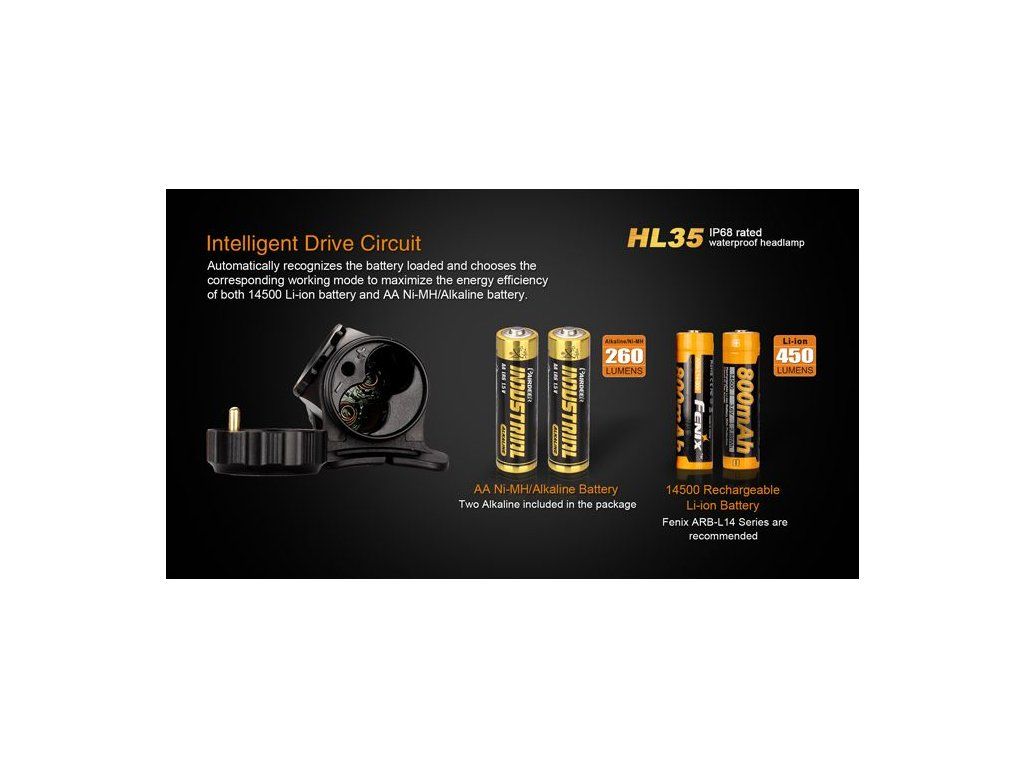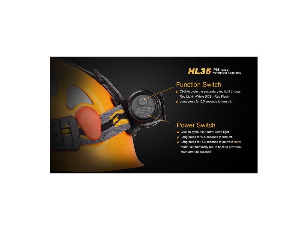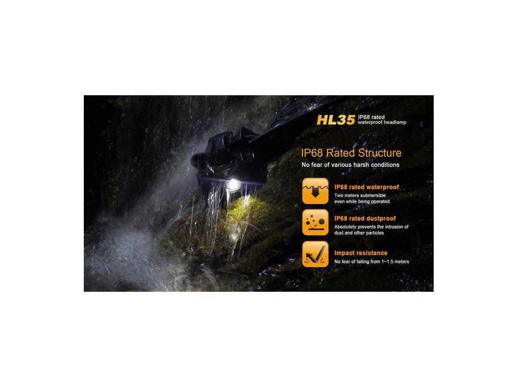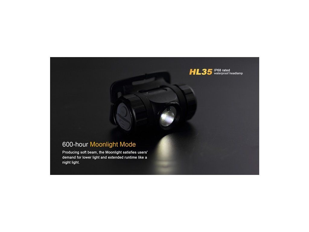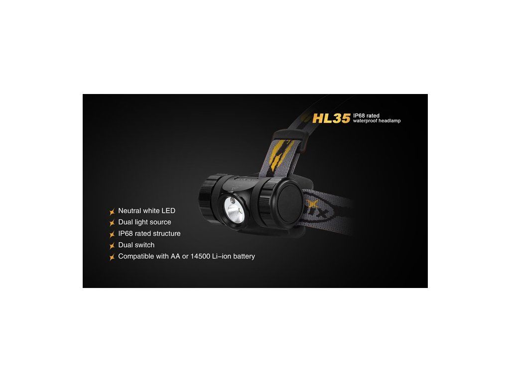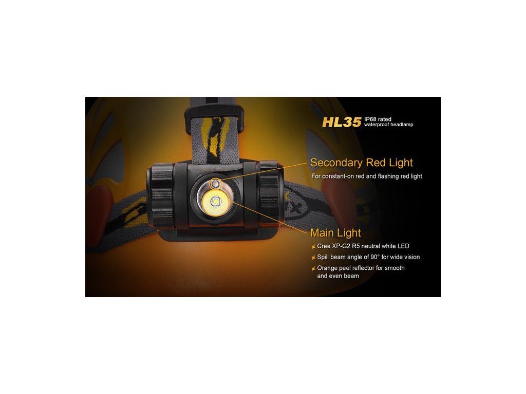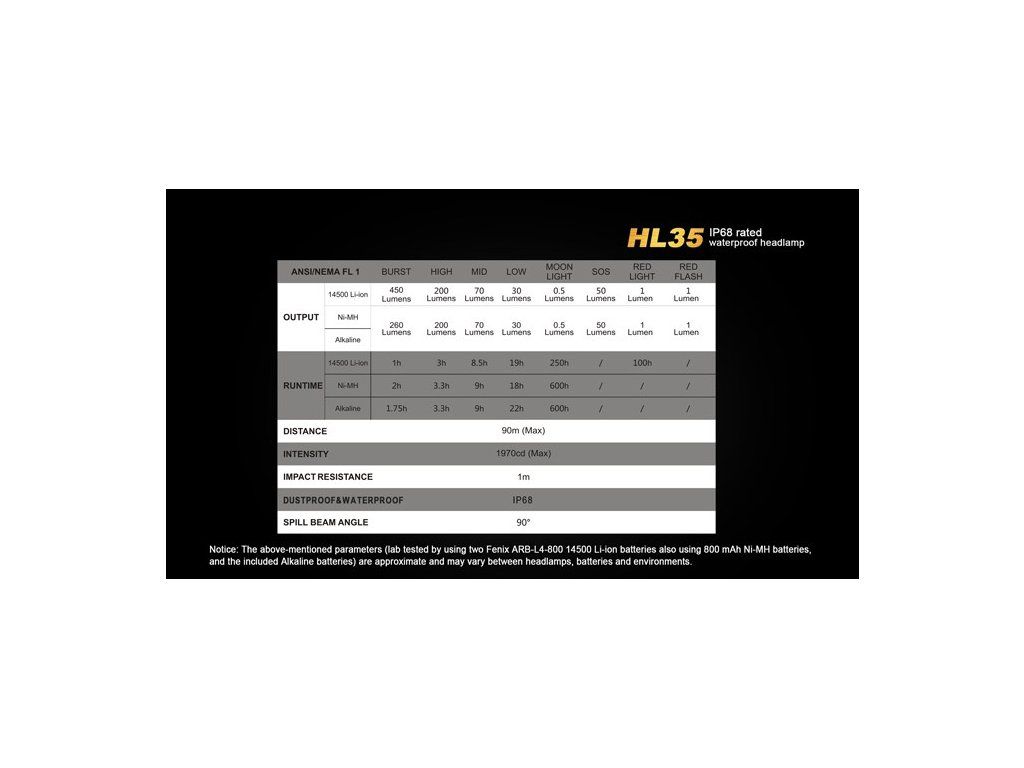 Výkonná čelovka Fenix HL35 je osadená diódou Cree XP-G2 R5 s teplejším odtieňom svetla a prináša svetelný tok až 450 lúmenov (ANSI) v BURST režime. Na napájanie je možné použiť dve klasické tužkové AA batérie (jednorazové aj nabíjacie) alebo dva Li-ion akumulátory typu 14500. Robustná celokovová konštrukcia čelovky zaisťuje optimálne chladenie a zároveň je nárazuvzdorná, vodotesná až 2 metre pod vodu aj prachotesná (podľa normy IP68). K dispozícii je celkom 8 režimov výkonu vrátane červeného svetla a SOS. V najnižšom režime s výkonom 0,5 lumenu vydrží HL35 svietiť až neuveriteľných 600 hodín (25 dní) v kuse. Vďaka elektronike s digitálnou konštantnou reguláciou svetelný výkon pri pozvoľnom vybíjaní batérií neklesá a zostáva stále rovnaký až do ich úplného vybitia. Textúrovaný reflektor vytvára svetelný kužeľ s celkovou šírkou 90 ° s intenzívnejším ohniskom, ktoré dosvieti až do vzdialenosti 90 metrov. Vzhľadom k vysokej odolnosti možno Fenix HL35 používať ako pracovnú čelovku na stavbách, či v priemyselných prevádzkach. Taktiež je vhodná pre jaskyniarov, na behanie, kempovanie, turistiku a červenú LED iste ocenia astronómovia.