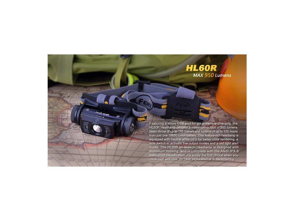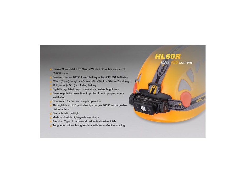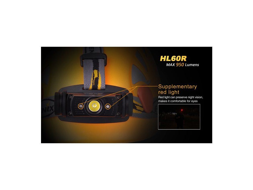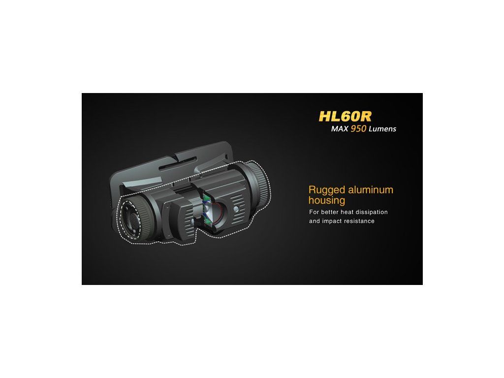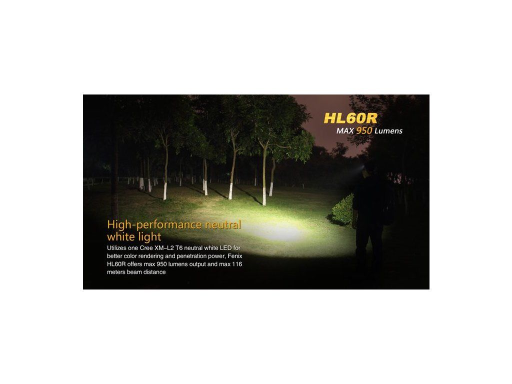 Fenix HL60R je extrémne výkonná nabíjacia čelovka, ktorá ponúka svetelný tok, až 950 lúmenov a dosvit 116 metrov. Súčasťou balenia je aj nabíjací 18650 Li-ion akumulátor s kapacitou 2600 mAh, ktorý sa nabíja priamo vo svietidle cez bočné micro USB konektor. Svetelným zdrojom je špičková LED Cree XM-L2 T6 s teplejším odtieňom svetla (neutral white). Výhodou tohto odtieňa svetla je prirodzenejšie a kontrastnejší podanie farieb v prírode. Celokovová konštrukcia zaisťuje vysokú odolnosť, optimálne chladenie a zároveň je plne vodotesné podľa štandardu IPX-8 až do hĺbky 2 metre pod vodou. K dispozícii je celkom 6 režimov výkonu vrátane červeného svetla s výdržou až 100 hodín. Čelovka je napájaná digitálne regulovaným konštantným prúdom pre zaručenie stáleho svetelného výkonu aj pri znižovaní napätia v batériách (pri ich pozvoľnom vybíjaní). Čelové svietidlo Fenix HL60R je obzvlášť vhodná pre bežecké lyžovanie, nočné beh, cyklistiku, turistiku, rybárčenie, speleológiu a červené svetlo iste ocenia všetci astronómovia.