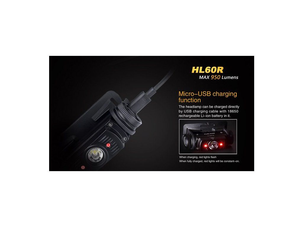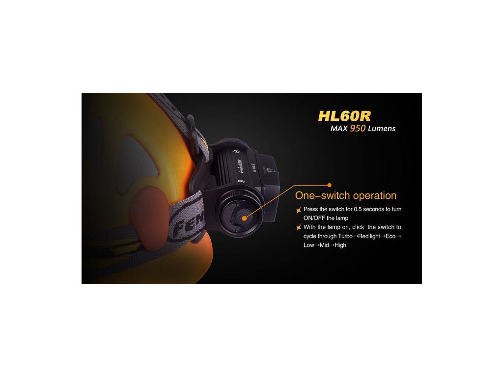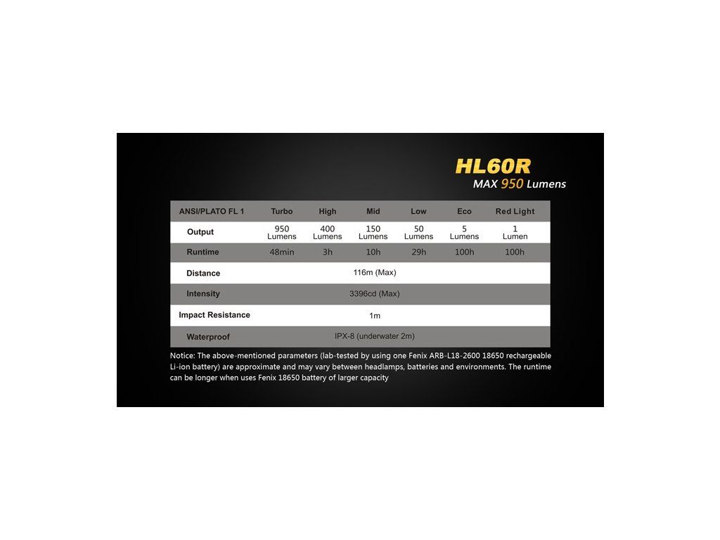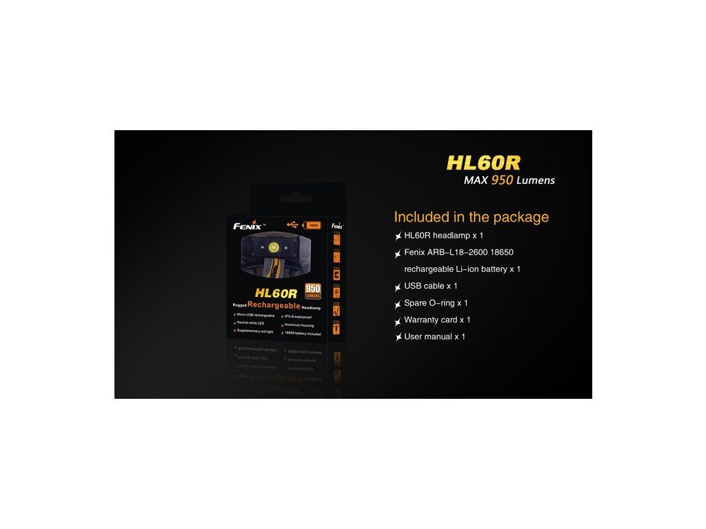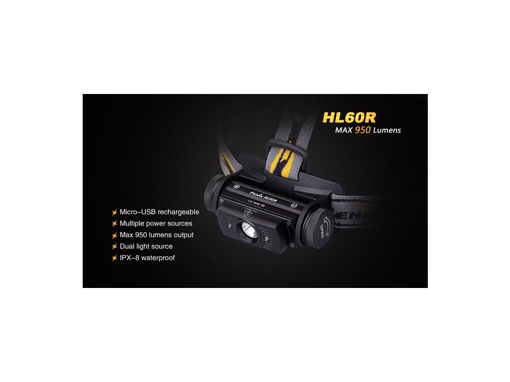Fenix HL60R je extrémne výkonná nabíjacia čelovka, ktorá ponúka svetelný tok, až 950 lúmenov a dosvit 116 metrov. Súčasťou balenia je aj nabíjací 18650 Li-ion akumulátor s kapacitou 2600 mAh, ktorý sa nabíja priamo vo svietidle cez bočné micro USB konektor. Svetelným zdrojom je špičková LED Cree XM-L2 T6 s teplejším odtieňom svetla (neutral white). Výhodou tohto odtieňa svetla je prirodzenejšie a kontrastnejší podanie farieb v prírode. Celokovová konštrukcia zaisťuje vysokú odolnosť, optimálne chladenie a zároveň je plne vodotesné podľa štandardu IPX-8 až do hĺbky 2 metre pod vodou. K dispozícii je celkom 6 režimov výkonu vrátane červeného svetla s výdržou až 100 hodín. Čelovka je napájaná digitálne regulovaným konštantným prúdom pre zaručenie stáleho svetelného výkonu aj pri znižovaní napätia v batériách (pri ich pozvoľnom vybíjaní). Čelové svietidlo Fenix HL60R je obzvlášť vhodná pre bežecké lyžovanie, nočné beh, cyklistiku, turistiku, rybárčenie, speleológiu a červené svetlo iste ocenia všetci astronómovia.