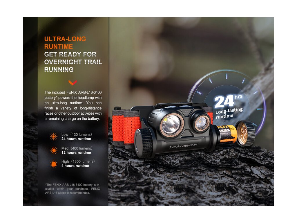 Nabíjateľná čelovka Fenix HM65R-DT sa vyznačuje konštrukciou z ľahkej magnéziovej zliatiny, vysokou odolnosťou voči vode i pádu, unikátnou konštrukciou s dvoma reflektormi a celkovým výkonom až 1500 lúmenov. Reflektory vytvárajú dobre zaostrené svetelné lúče. Jeden so studenejším bielym svetlom cca 6500K (tzv. studená biela) a druhý s teplým bielym svetlom cca 3000K. Svetelný tok hlavného reflektora je až 1300 lúmenov, druhý reflektor ponúka maximálny výkon 400 lúmenov. Ovládanie oboch LED je na sebe nezávislé, svetlo z oboch reflektorov je možné ľubovoľne kombinovať a dosiahnuť tak svetelný tok až 1500 lúmenov (pri zapnutí oboch reflektorov naraz je ich max. výkon 1150 + 350 lúmenov). Oba svetelné zdroje ponúkajú tri režimy svietenia. Na napájanie slúži jeden Li-ion akumulátor typu 18650 s kapacitou 3400 mAh, ktorý je súčasťou balenia a nabíja sa cez moderný USB-C konektor priamo v čelovke. V prípade núdze je možné čelovku napájať aj dvoma jednorazovými batériami CR123A.