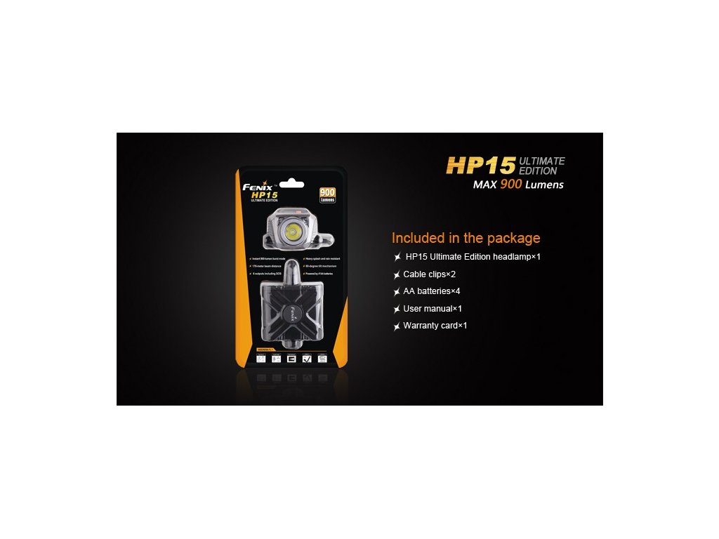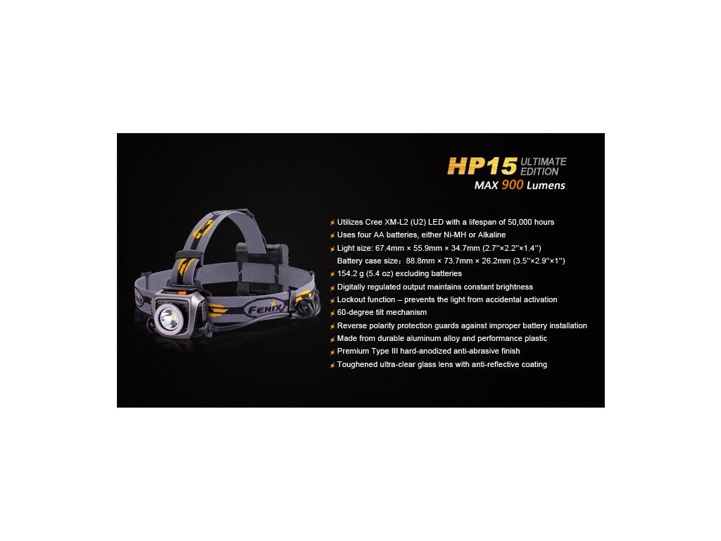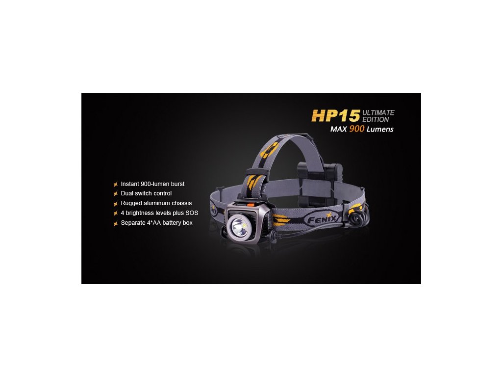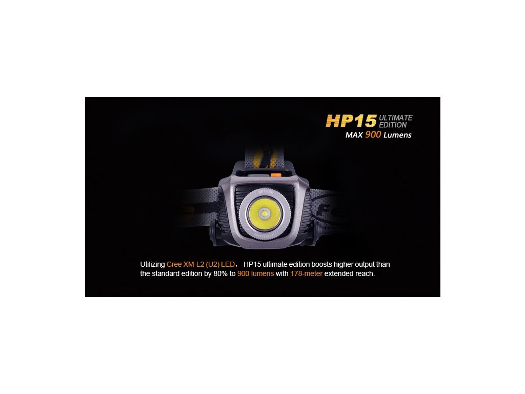LED čelovka Fenix HP15 Ultimate Edition ponúka bezkonkurenčný výkon až 900 lúmenov (ANSI) a dosvit 178 metrov. Na napájanie používa štyri tužkové AA batérie, ktoré sú umiestnené v puzdre na zátylku. Výborného výkonu bolo dosiahnuté použitím najnovšej LED Cree XM-L2. Jedná sa tak o najsilnejše čelové LED svietidlo na tužkové batérie na trhu! Čelovka ponúka celkom 6 režimov výkonu vrátane SOS signálu pre použitie v núdzových situáciách. V najnižšom režime s 10 lumenmi poskytuje výbornú výdrž až 170 hodín (7 dní). Čelovka je napájaná digitálne regulovaným konštantným prúdom pre zaručenie stáleho svetelného výkonu aj pri znižovaní napätia v batériách (pri ich pozvoľnom vybíjaní). HP15 Ultimate je vhodná pre rad outdoorových aktivít, napríklad bežecké lyžovanie, skialpinizmus, nočný beh, cyklistiku, rybárčenie, speleológiu a ďalšie aktivity.