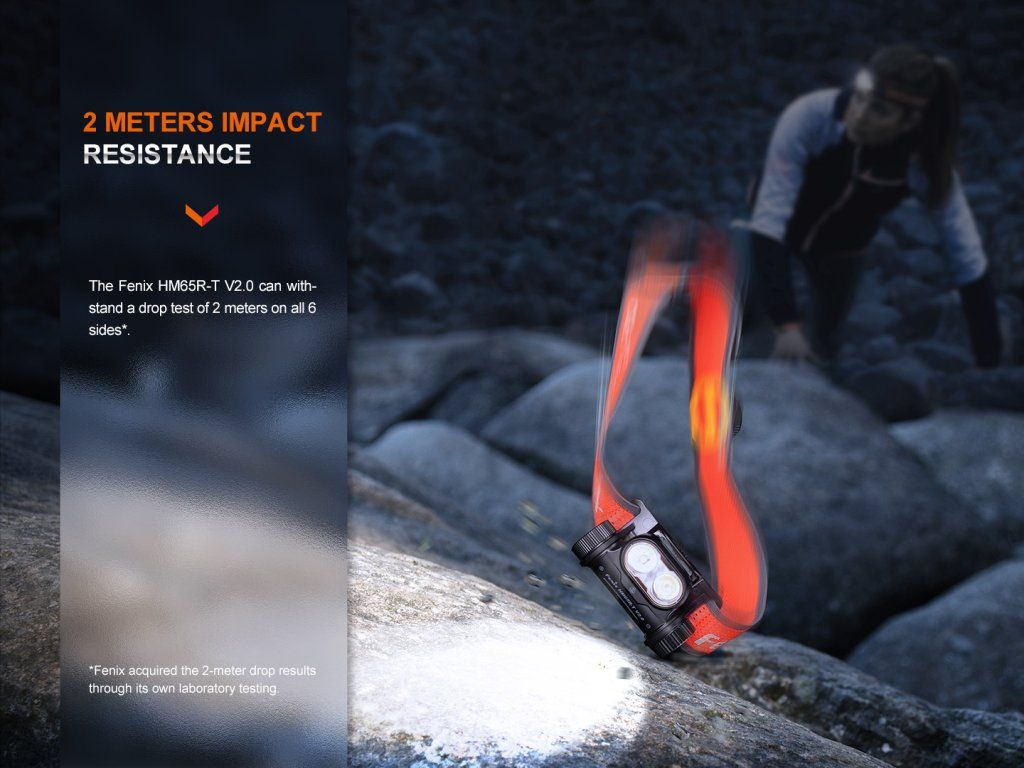 Nabíjateľná čelovka Fenix HM65R-T V2.0 sa vyznačuje konštrukciou z ľahkej magnéziovej zliatiny, vysokou odolnosťou proti vode i pádu, unikátnou konštrukciou s dvoma reflektormi a svetelným výkonom až 1600 lúmenov. Reflektory vytvárajú dobre zaostrené svetelné lúče, ktoré svietia do diaľky aj na blízko zároveň. Hlavný reflektor svieti chladným bielym svetlom cca 6500K (tzv. denná biela) a sekundárny svieti teplým bielym svetlom s odtieňom cca 3000K (kužele však nemožno kombinovať). Teplé svetlo lepšie preniká hmlou, dažďom aj padajúcim snehom, takže ho využijete obzvlášť za zlých meteorologických podmienok.