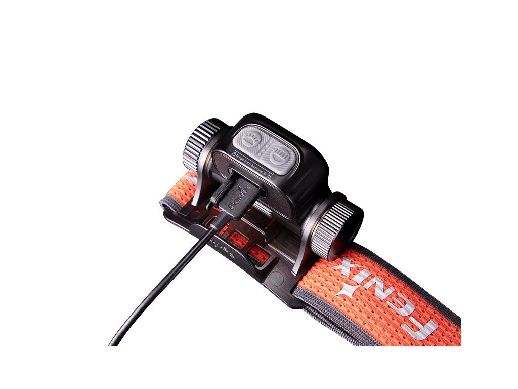 Odklopte krytku USB-C konektora a zapojte priložený nabíjací kábel, druhý koniec kábla zapojte do počítača, powerbanky alebo USB adaptéra do elektrickej siete, či auta (nie sú súčasťou balenia). Počas nabíjania stavové LED ukazujú priebeh nabíjania. Po skončení nabíjania svietia všetky štyri. Nabitie úplne vybitého akumulátora trvá cca 3 hodiny. Počas nabíjania je možné čelovku používať iba v nízkom režime hlavného alebo sekundárneho reflektora.
