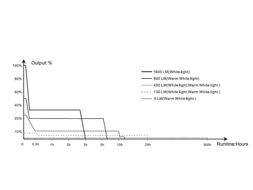 - Doba svietenia: Hl. LED TURBO 1600lm (3hod.) TURBO100% -> 400lm (12hod.) 25% -> 130lm (24hod.) 8%// Sek. LED 800lm (6hod.) 100%, 400lm (12hod.) 50%, 130lm (24hod.) 16%. 5lm (300hod.) 1%, SOS 1% 5lm (600hod.)