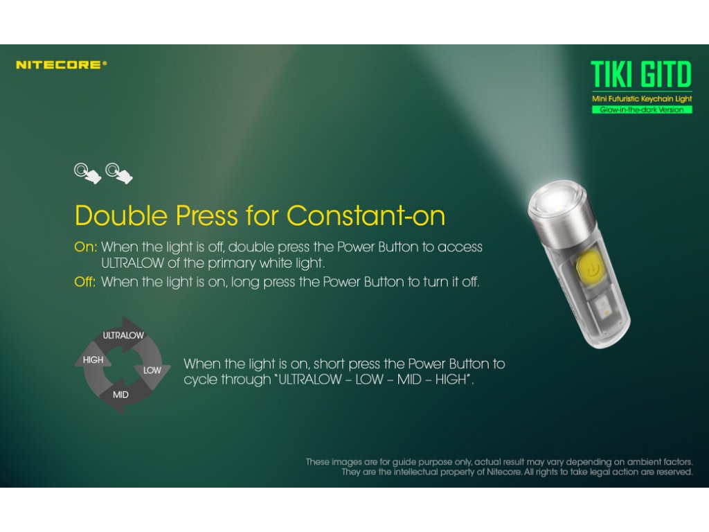 Z vypnutého stavu sa 2x rýchlym stlačením tlačidla po sebe, aktivuje kľúčenka v ultranízkom režime svietenia 0,03% 1lm. Následná zmena režimov svietenia: 5%, 20%, 100% sa vykonáva cyklickým stláčaním tlačidla.