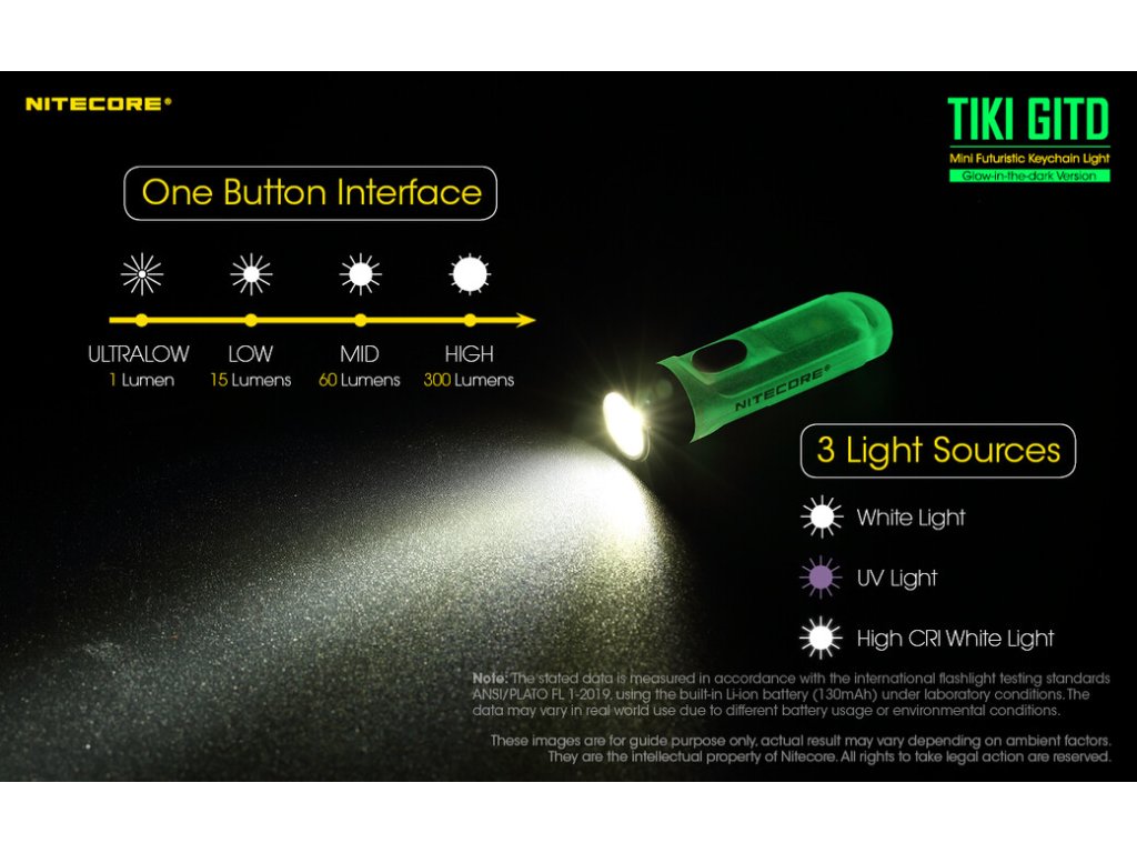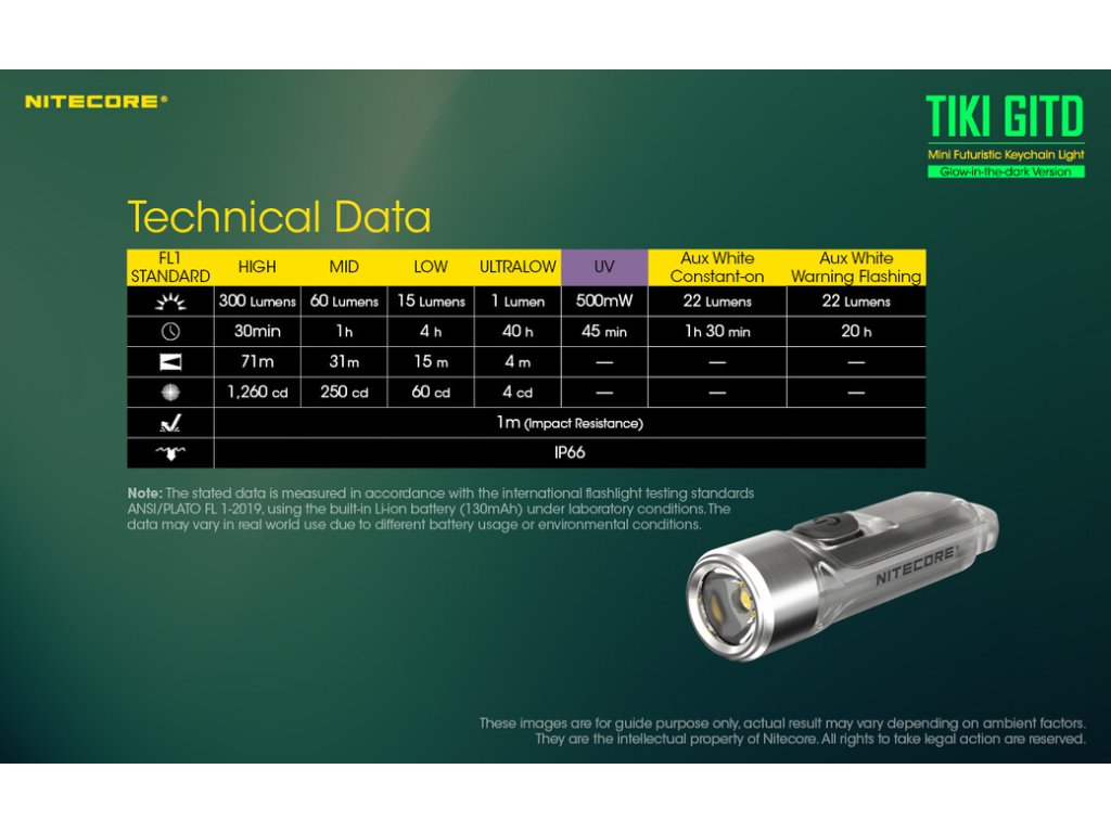 Malá LED kľúčenka NITECORE TIKI, jednoduchým kliknutím na jedno ovládacie tlačidlo, prekvapí max. výkonom 300lm s dosahom svetla 71m. Táto mimoriadne ľahká kľúčenka so vstavaným Li-ion akumulátorm s kapacitou 130mAh 3,6V a hmotnosťou iba 25g, má užívateľsky prívetivé ovládacie rozhranie. Telo TIKI je vyrobené zo zliatiny odolných PC materiálov s hlavou vyrobenou zo zliatiny nehrdzavejúcej ocele. Môže sa pochváliť stupňom krytia IP66, čo zaručuje, že táto praktická kľúčenka, bude použiteľná v akomkoľvek počasí. Nabíjanie vstavaného Li-ion akumulátora, prebieha pomocou Micro-USB konektora, ktorý je osadený v tele LED kľúčenky, pod gumenou krytkou. Priebeh nabíjania je signalizovaný svietením farebnej indikačnej LED z boku na tele. TIKI sa tým pádom pohodlne nabíja. Na najnižšom režime svietenia, dokáže svietiť až 40hod. Jednoduchým krátkym stláčaním tlačidla, prechádzate medzi štyrmi úrovňami jasu hlavnej LED: 100%, 20%, 5%, 0,03%. Z bočnej strany tela sa nachádza aj 1x UV LED 500mW, ktorá ponúka 100% režim svietenia, hodí sa overovanie bankoviek a 1x High CRI biela LED, ktorá ponúka režimy svietenia: 100% 22lm a Blikanie. Unikátne je telo kľúčenky, ktoré je cez deň priehľadné, mliečne zafarbené. Pri svietení bočnej bielej CRI LED, slúži kľúčenka TIKI GITD aj ako mini kempingová lampa. V tme telo kľúčenky vo vypnutom stave fosforeskuje - svieti na zeleno, takže ho napr. ľahko nájdete niekde pohodené v tme. Telu TIKI GITD stačí, aby bolo vystavené svetelnému žiareniu, aspoň na 1sek., napr. od slnka alebo iného zdroja svetla (LED ručná baterka). Praktický je aj kovový krúžok (obsah balenia), pre prichytenie svietidla na kľúče, čiže hu môžete nosiť vždy so sebou. Nitecore TIKI GITD je ideálna pre použitie, ako prívesok na kľúče, tašku a v podstate kamkoľvek si môžete toto kompaktné kľúčenkové svietidlo pripnúť.