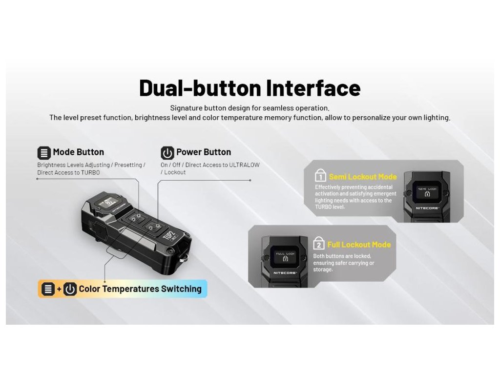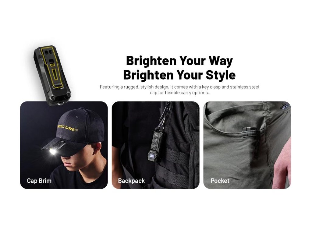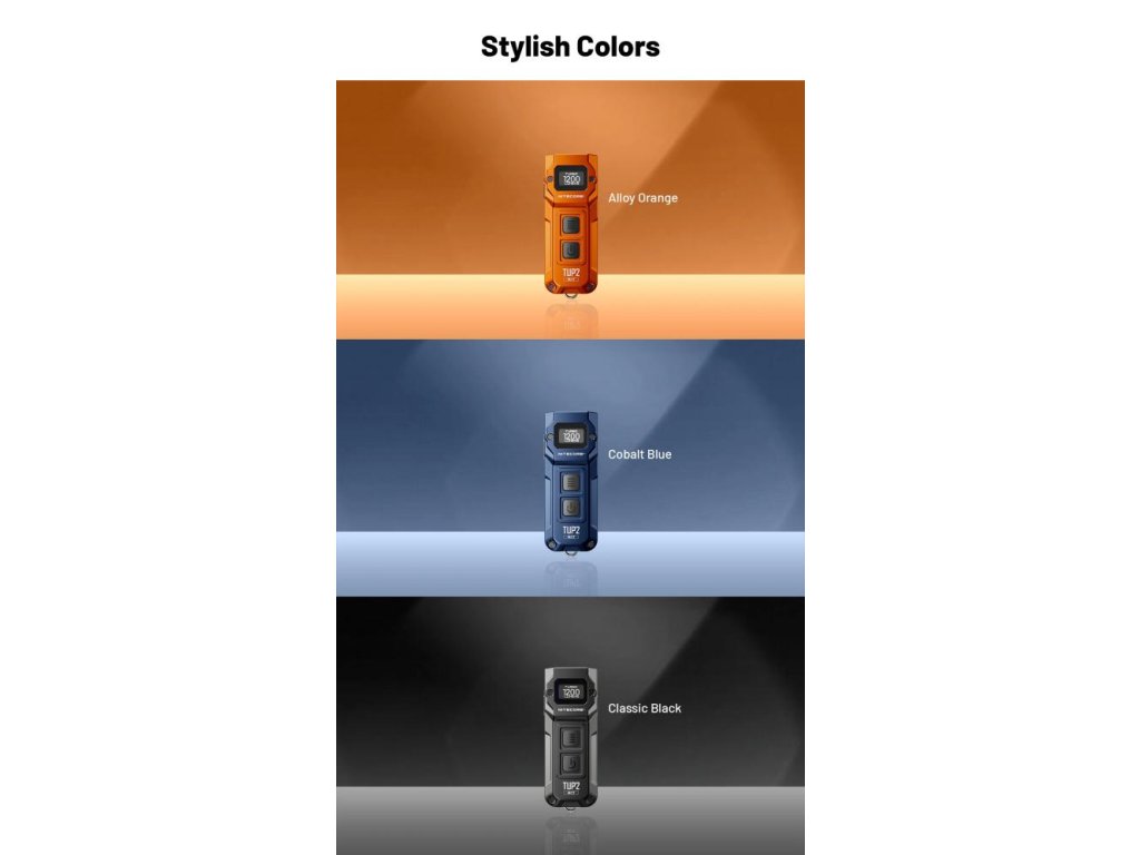 V skratke: Jediné kľúčenkové LED s prepínateľnými 3 farebnými teplotami, inovatívnym OLED displejom zobrazujúcim zostávajúci čas a metal ring pull certifikovaným na 30kg. Výkon 1200 lúmenov v kompakte 70mm × 27mm. Must-have EDC doplnok v nadčasovej čiernej.