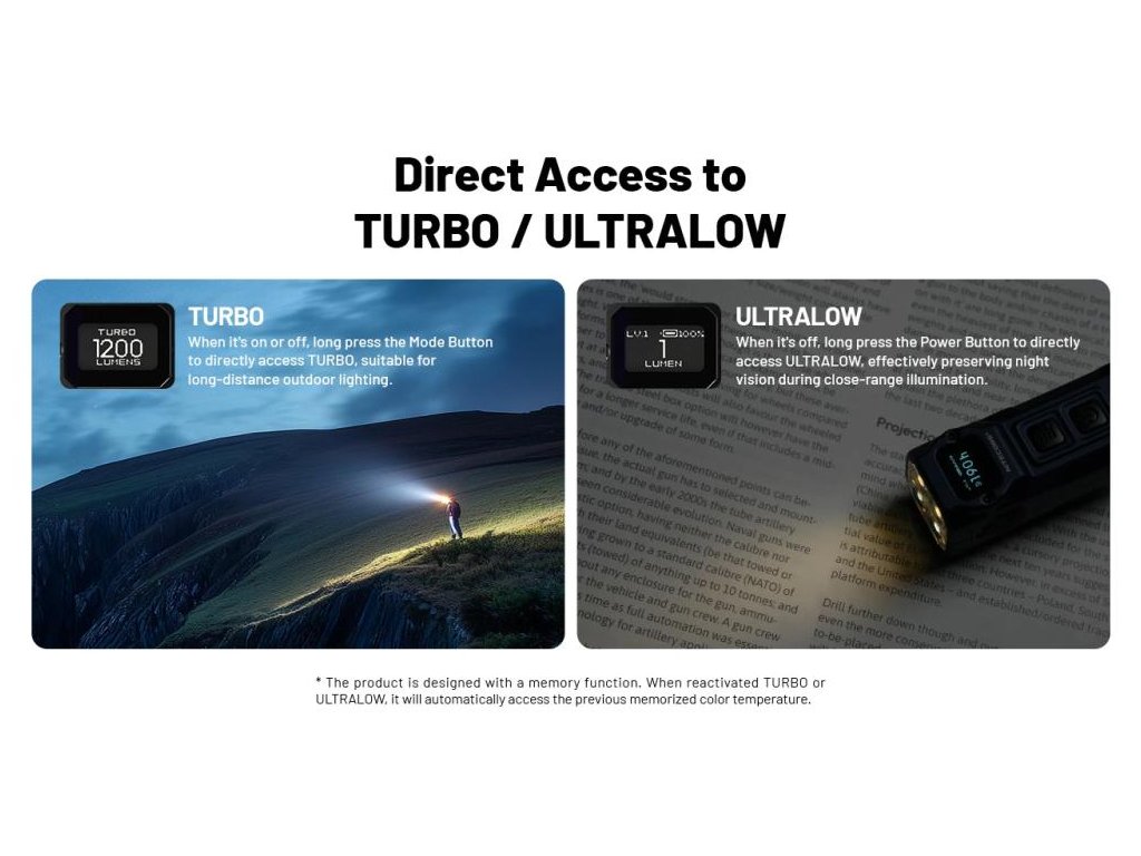 Bezpečnostné služby: Priamy prístup k TURBO (1200 lm) alebo ULTRALOW (1 lm) bez prepínania režimov. Studená 6500K poskytuje maximálny kontrast pri nočných kontrolách. OLED displej zobrazuje zostávajúci čas - vždy viete, či máte 2 hodiny alebo 190 hodín.
