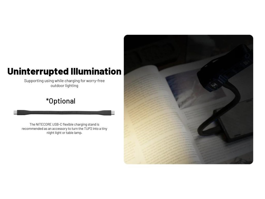Áno, TUP2 podporuje funkciu use-while-charging - môžete svietiť aj počas nabíjania. To je užitočné v núdzových situáciách alebo keď potrebujete nepretržité osvetlenie (napr. výpadok elektriny). Pripojte LED k powerbanke alebo USB adaptéru a používajte normálne. Voliteľné príslušenstvo USB-C flexible charging stand (predáva sa samostatne) umožňuje použiť TUP2 ako stolnú lampičku alebo nočné svetlo - jednoducho ho pripojíte k nabíjačke a postavíte na stôl. Inteligentný nabíjací obvod zabezpečuje, že batéria sa neprehreje ani pri súčasnom používaní a nabíjaní.