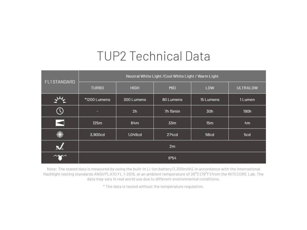 Áno, TUP2 je ideálne pre turistiku a camping. Výdrž až 190 hodín v ULTRALOW režime vystačí na celý víkendový trip bez potreby nabíjania. V TURBO režime (1200 lm) dosiahnete dosah 125 metrov - vidíte vzdialené objekty v lese alebo na skale. IP54 odolnosť znamená, že zvládne dážď a prach, certifikované pády z 2 metrov vydrží aj na skalisku. Teplá 3000K farba svetla prenikne hmlou lepšie než studená - ideálna pri zlom počasí. Metal ring pull vydrží 30kg záťaž - môžete ho bezpečne pripevniť na batoh alebo karabínu. Full-lockout režim zabráni náhodnému zapnutiu v tesnol naplnenom batohu.