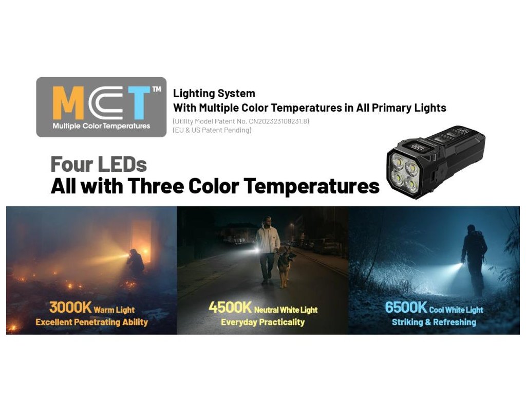 Proprietárna MCT technológia integruje tri farebné teploty do jedného kľúčenkového svietidla. Teplá 3000K prenikne hmlou a dažďom lepšie než studená. Neutrálna 4500K poskytuje prirodzené videnie farieb pri opravách a čítaní. Studená 6500K ponúka maximálny výkon a dosah. Prepínanie: Mode + Power súčasne.
