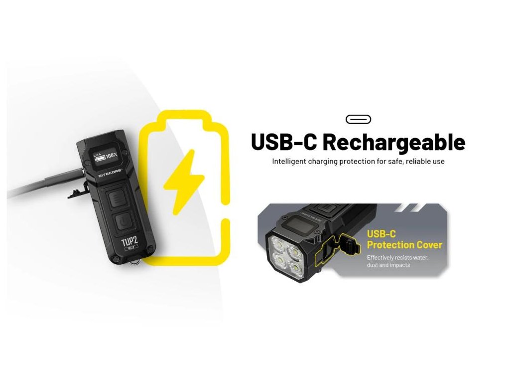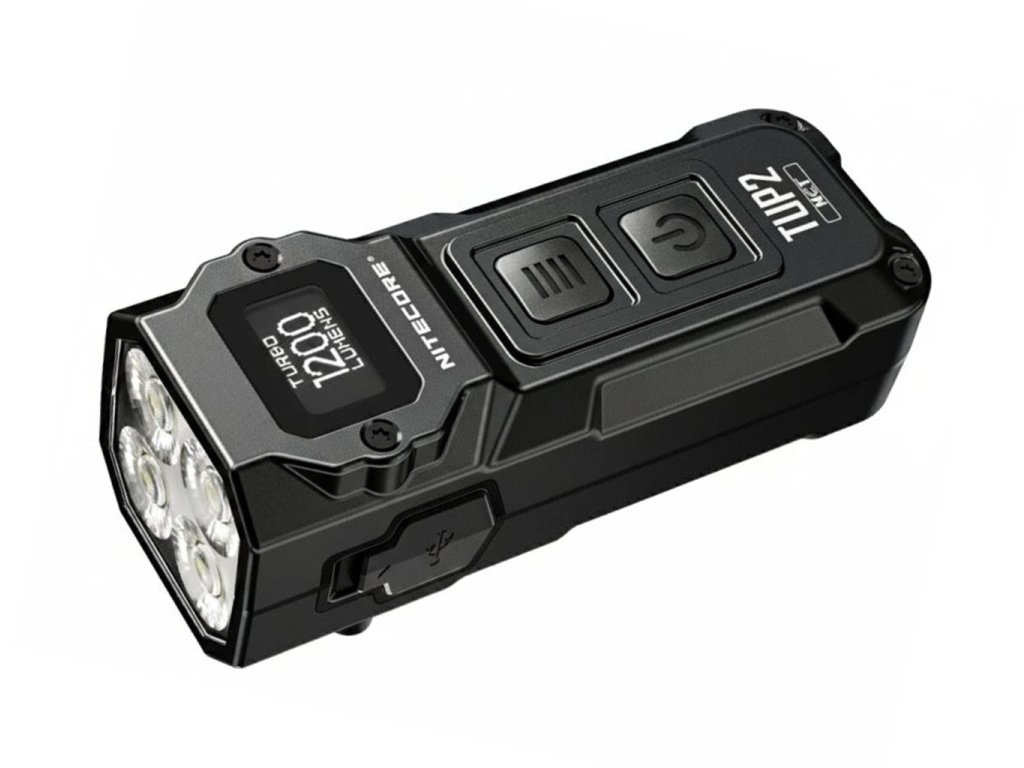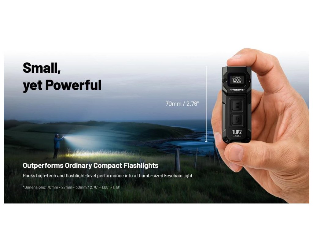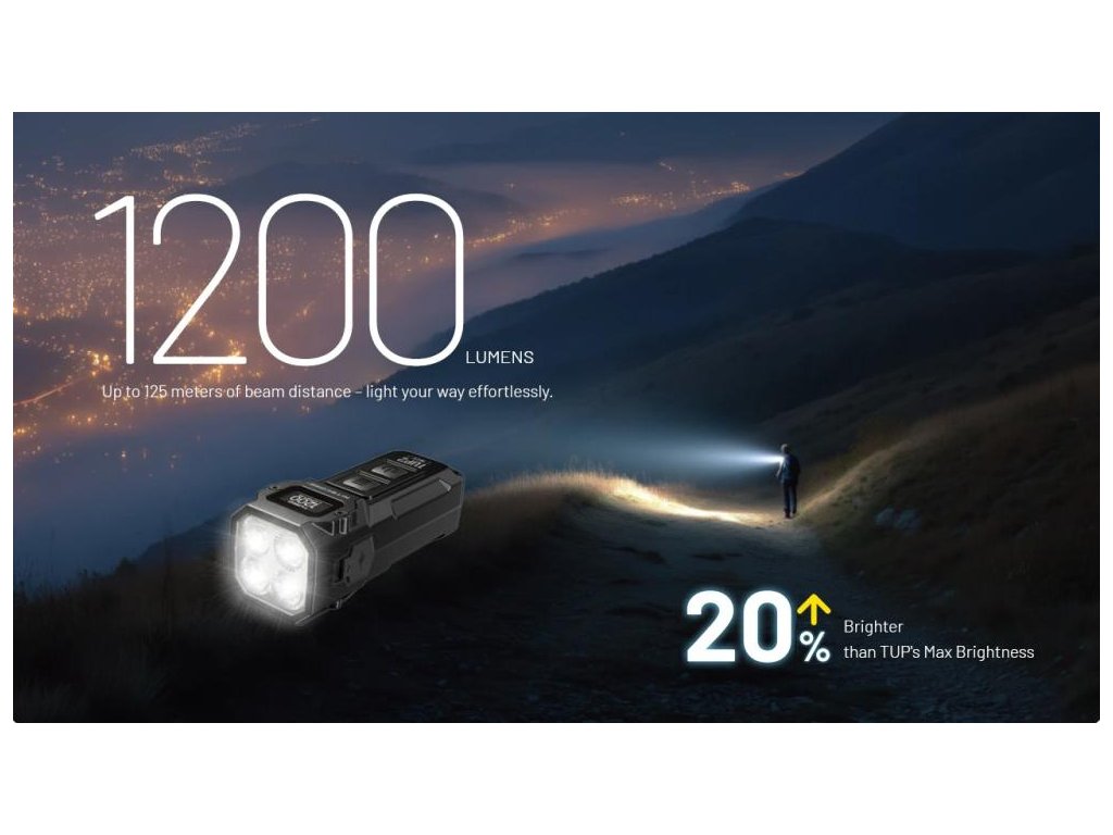 - Kompaktnosť bez kompromisov: 70mm × 27mm a 70g znamená, že TUP2 na kľúčoch nepoznáte, no výkon 1200 lúmenov a dosah 125m konkuruje väčším LED baterkám
