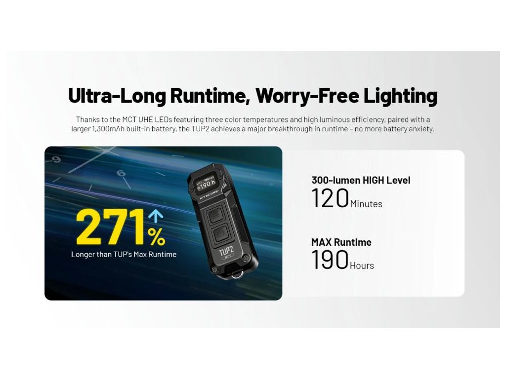 - 🔋 Ultra-dlhá výdrž až 190 hodín: Vďaka veľkej 1,300mAh batérii a ultra-efektívnym MCT UHE LED dokáže svietiť takmer týždeň nepretržite - o 271% dlhšia výdrž než pôvodný TUP