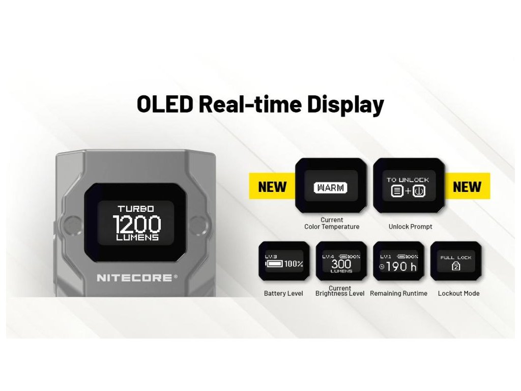 - Inovatívny OLED displej: Real-time zobrazovanie lúmenov, farebnej teploty, % batérie a zostávajúceho času - informácie, ktoré štandardné kľúčenkové LED neponúkajú
