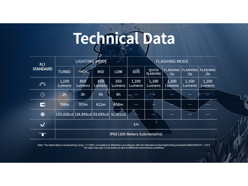- Maximálny svetelný tok: 1,100 lúmenov (TURBO pre deep dive)