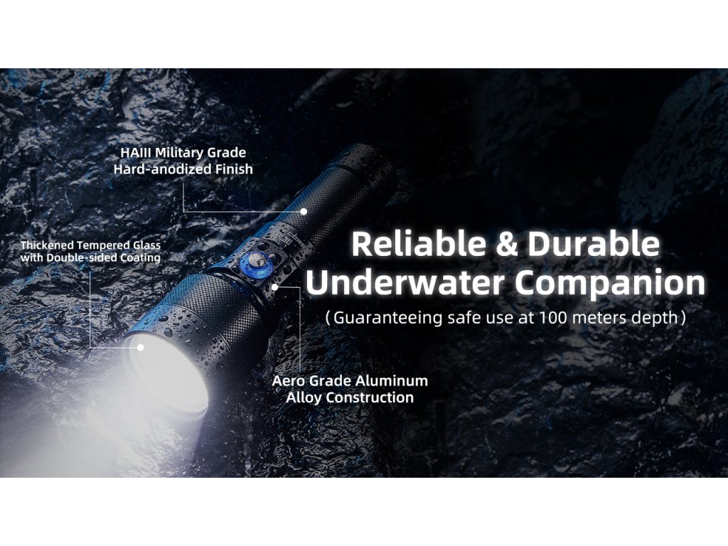 Oficiálne certifikované dokumenty potvrdzujú vodotesnosť IP68 s garantovanou funkčnosťou do 100 metrov hĺbky pre hlbokomorské potápanie. HAIII Military Grade hard-anodizovaná úprava z leteckého hliníka zabezpečuje maximálnu odolnosť proti korózii v slanej vode. Nárazuvzdorná potápačská baterka s thickened tempered glass odolá tlaku a poskytuje krištálovo čistý svetelný lúč. Hmotnosť pod vodou len 126g (namiesto 273g na vzduchu) výrazne znižuje únavu počas dlhých tech ponorov a cave diving.