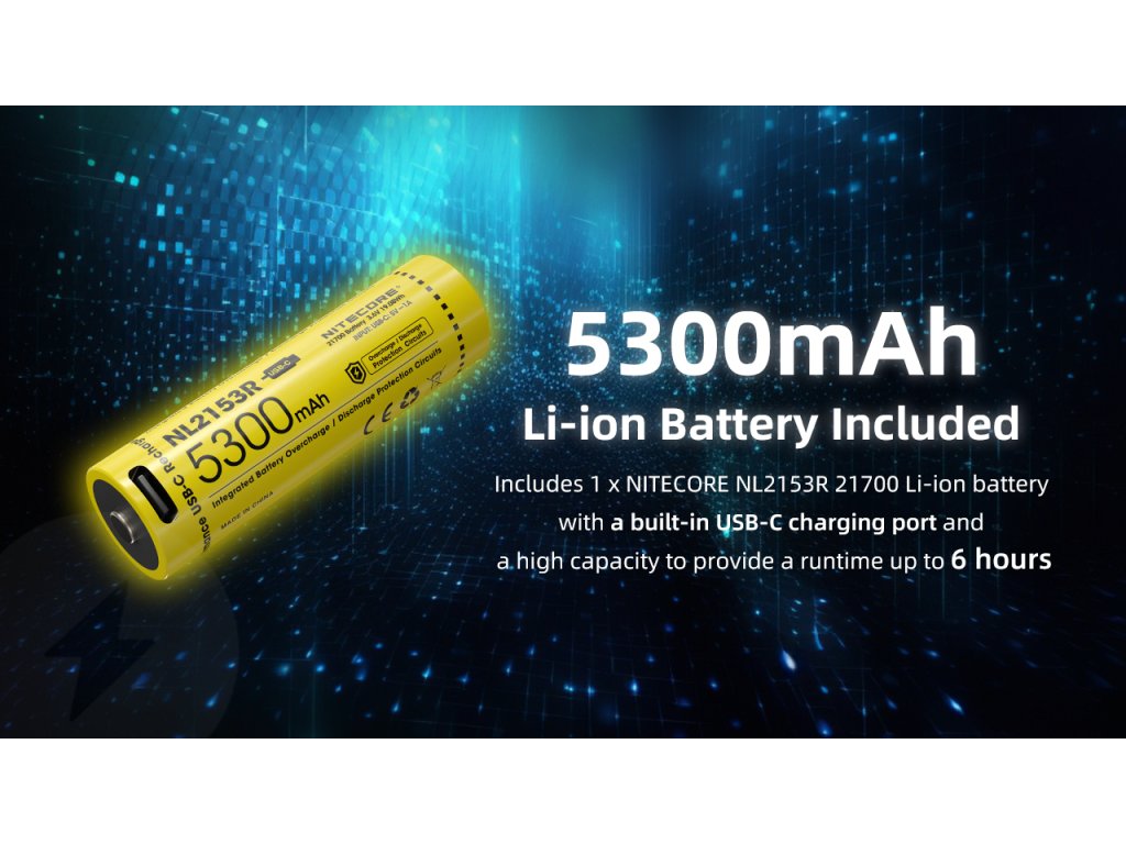 - Batéria: NITECORE NL2153R 21700 Li-ion (5,300mAh)