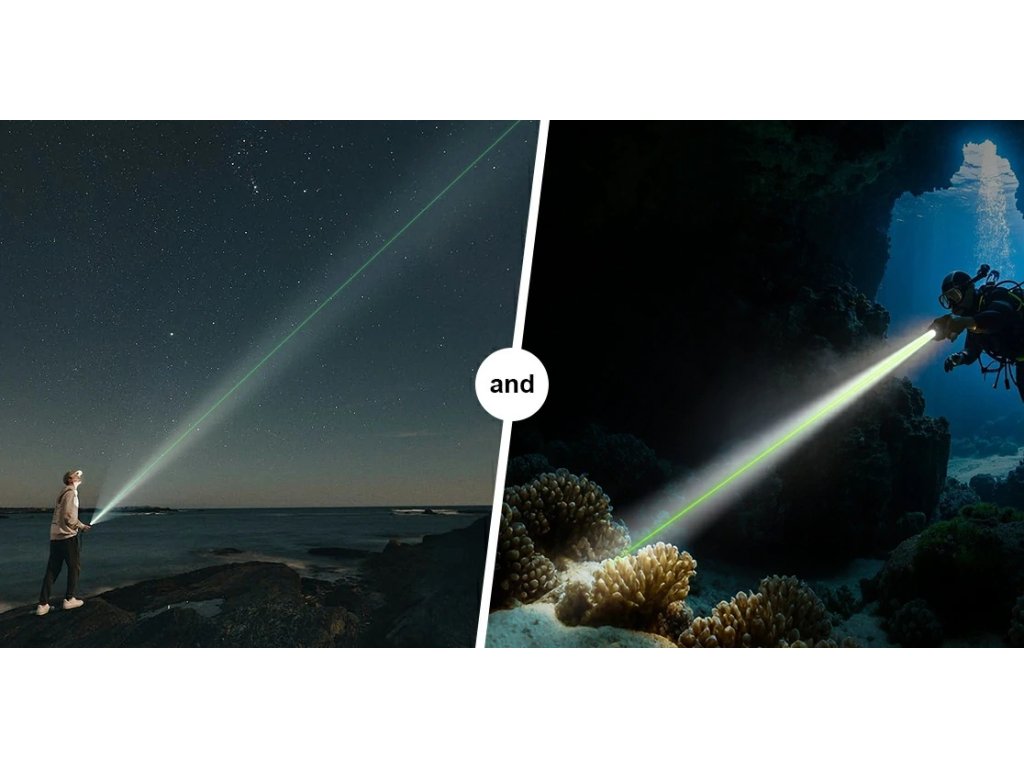 LED potápačská baterka + zelený laserový UltraPointer XTAR Pointer DL2, 1600m, 1x Li-ion aku. 21700 4000mAh 3,6V - SET